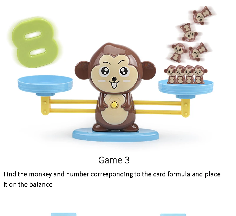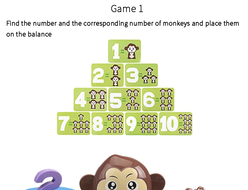 Игра 1Найдите номер и соответствующее количество обезьян и поместите их на балансИгра 2Подсчитайте количество обезьян на карте и поместите обезьян на баланс, пока они не будут сбалансированыИгра 3Найдите обезьянку и номер, соответствующий формуле карты, и поместите ее на баланс