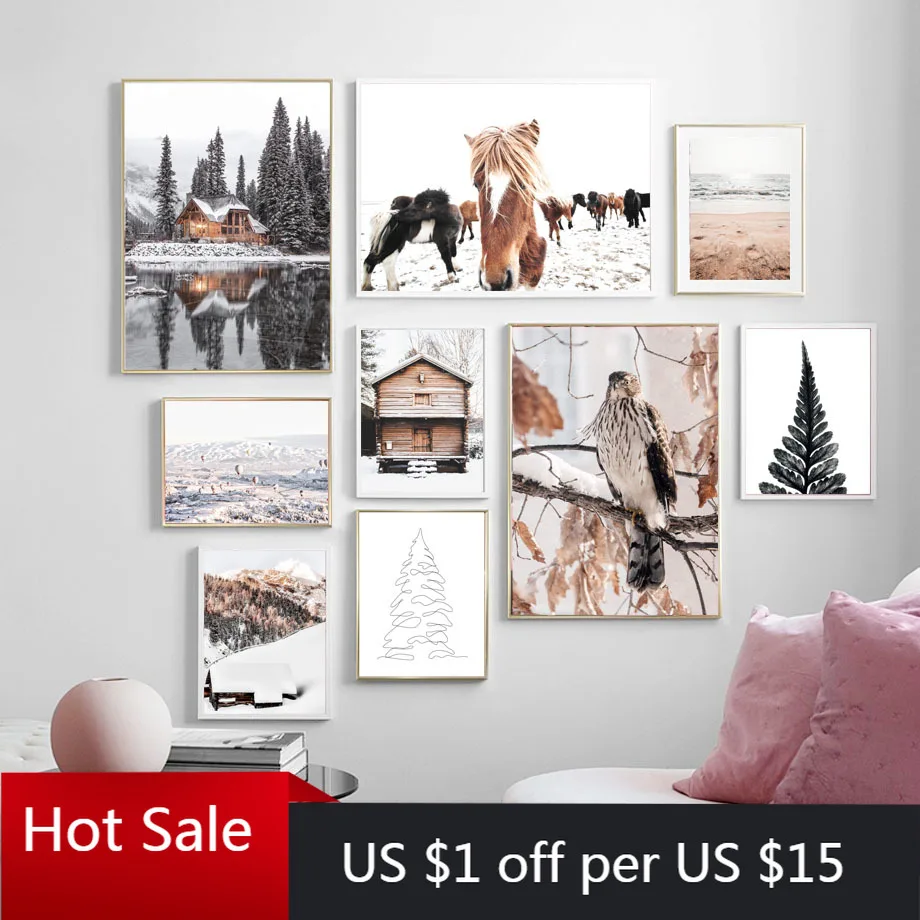 Снег озеро дом Pine eagle живопись на холсте с изображением лошади Nordic печать настенный художественный Декор картинки для Плакаты эстетическое украшение комнаты с орнаментом Рождественские