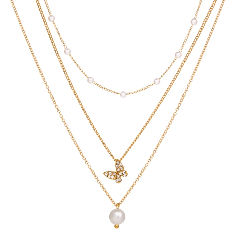 Ожерелье женское, многослойное, золотистое, с бабочкой и жемчугом, ...