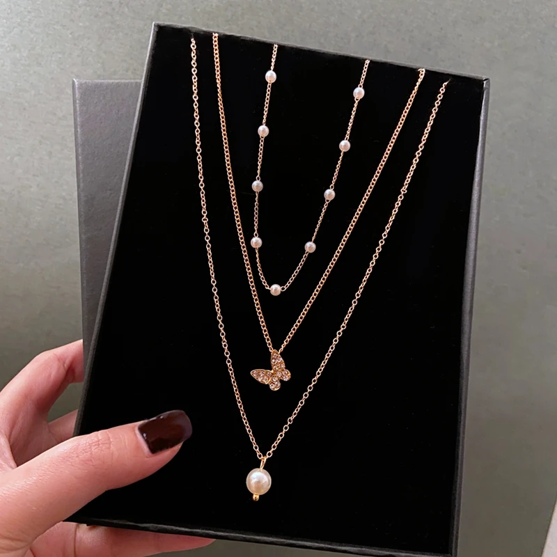 Ожерелье многослойное с жемчугом и бабочкой женское, модное колье-ч...