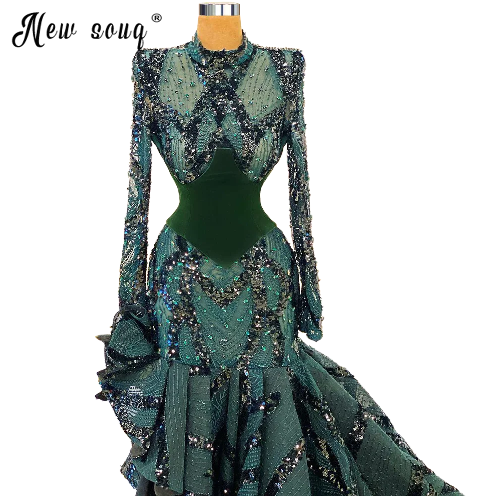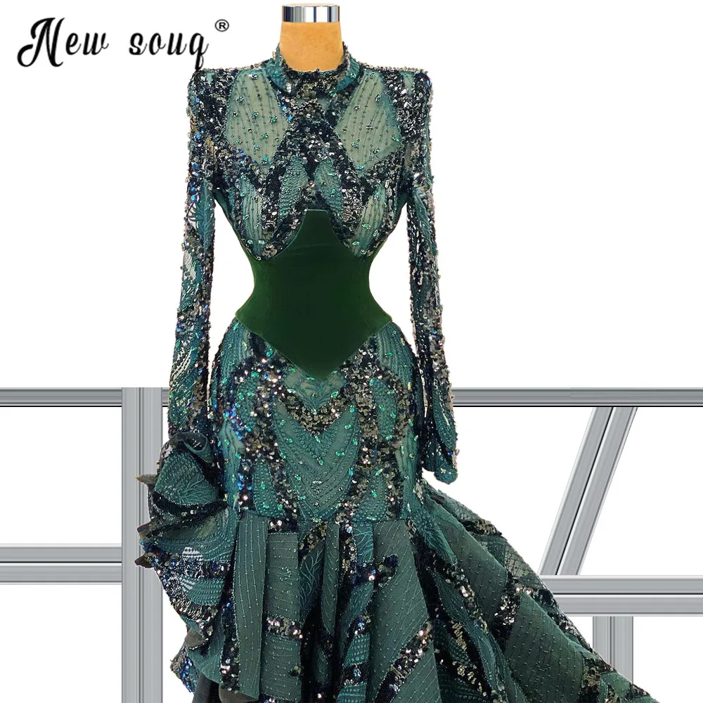 Темно-зеленое платье с длинным рукавом для выпускного вечера, мусульманское платье русалки, платье с павлиньим высоким воротом, 2021, вечернее платье для вечеринки, турецкое платье