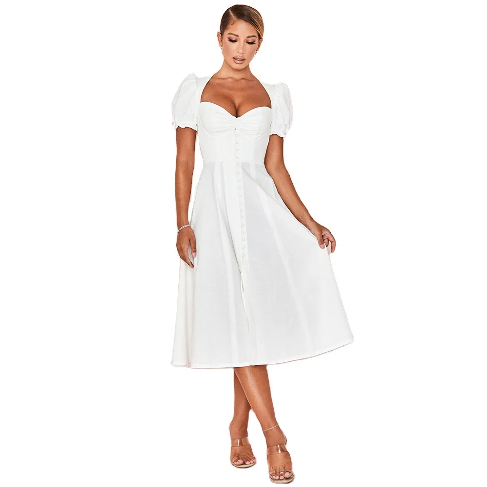 Женское платье с коротким рукавом FAKUNTN, белое кружевное платье с высоким разрезом, французское платье с пышными рукавами в уличном стиле, 2020