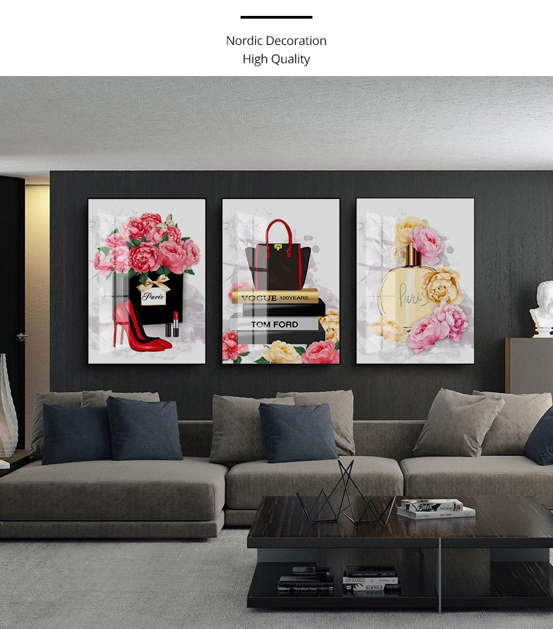Сумочка с духами на высоких каблуках, модный плакат, макияж, цветочный принт, холст, искусство, Настенная картина, Современное украшение для комнаты, дома icon star icon star icon star icon star icon star