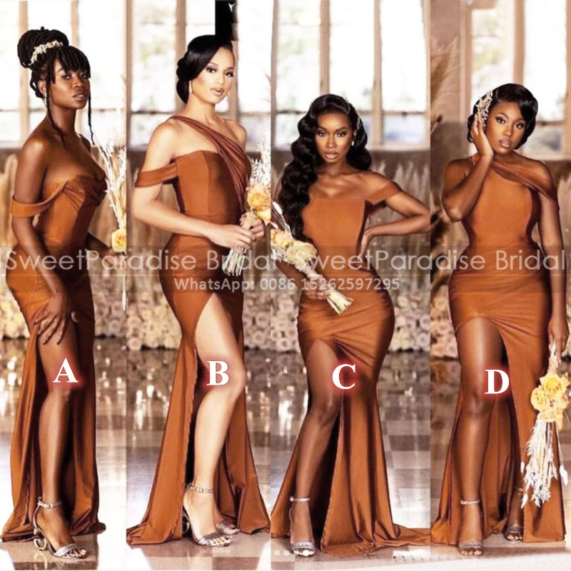 Новейшие бронзовые платья подружки невесты с высоким разрезом 2021 Русалка длинное Африканское женское официальное выпускное платье Свадебная вечеринка индивидуальный заказ халат De Soiree De Mariage корсет сзади под 100