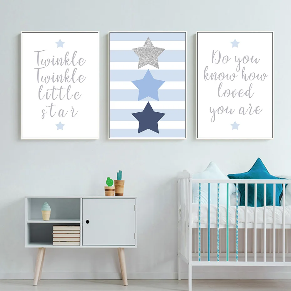 Голубые плакаты со звездами и именем малыша на заказ, Картина на холсте для детской комнаты, художественные принты, картины, украшение для детской комнаты