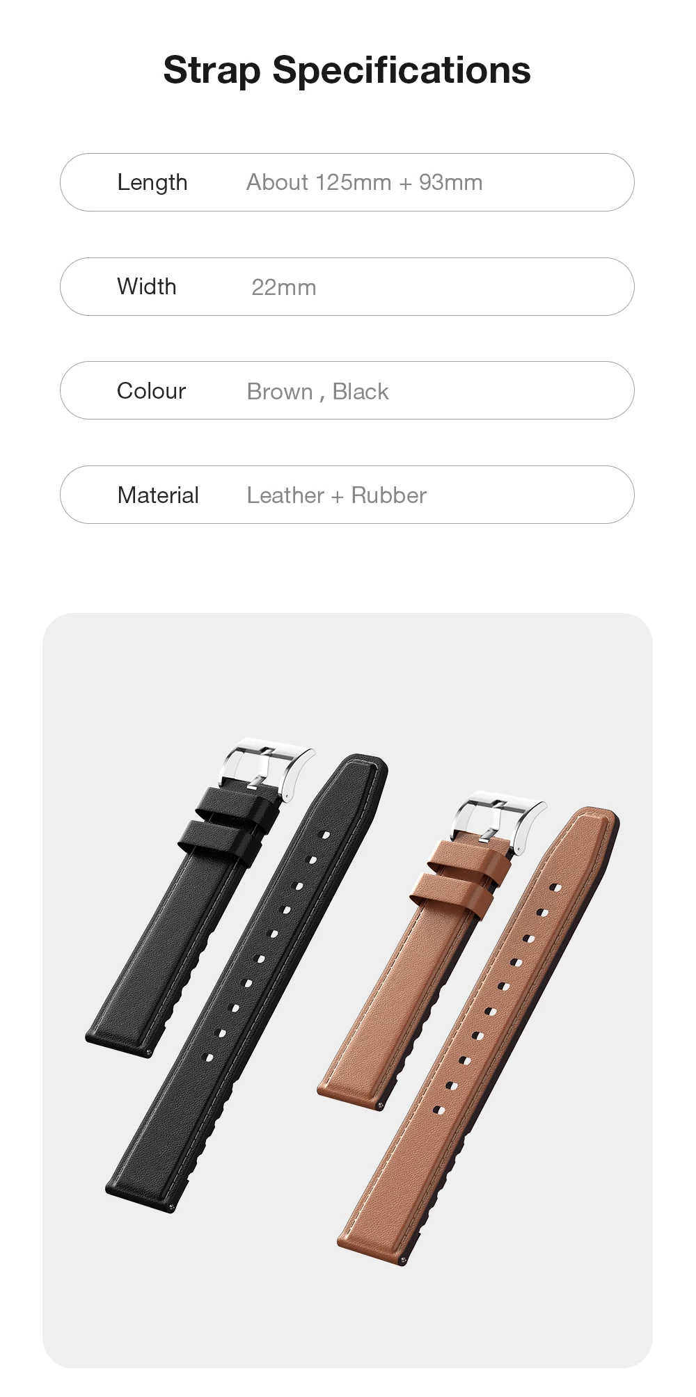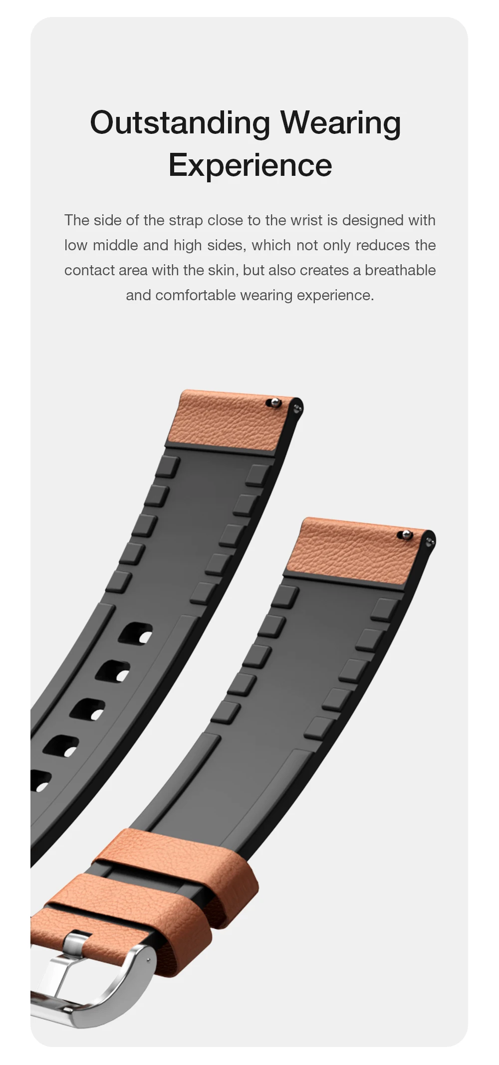 Ремешок изготовлен из кожи, соединенной с высококачественной резиной высокого качества. Отличительная текстура кожи делает ее прочной и эластичной. Резиновый материал не только удобен в носке, но и устойчив к поту и загрязнениям.