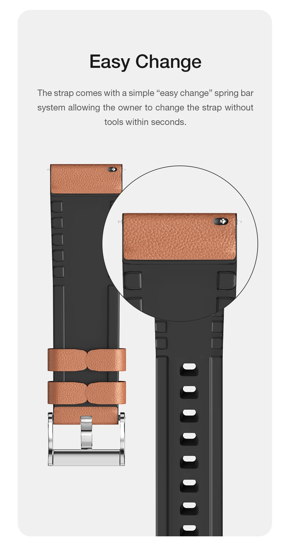 Ремешок поставляется с простой системой пружинной пружины «легко изменить», что позволяет владельцу менять ремешок без инструментов в течение нескольких секунд.