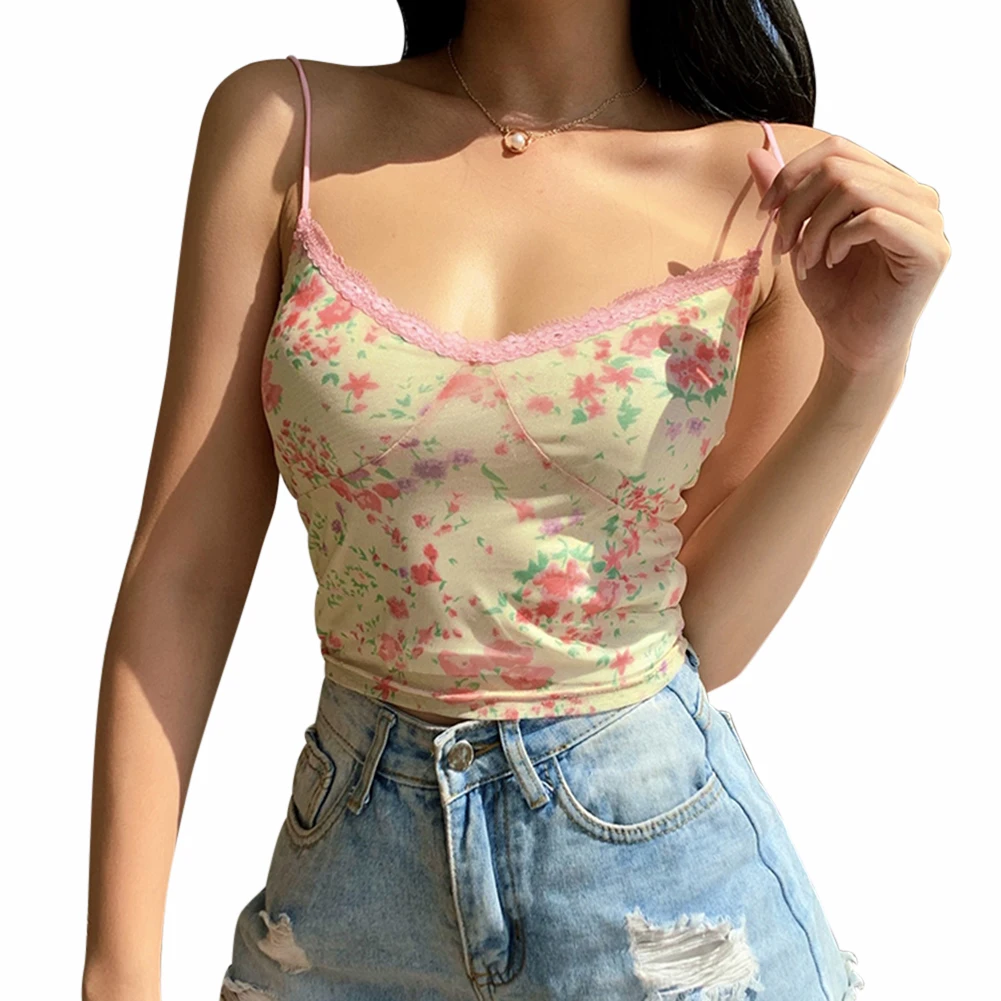 2021 Женская мода Цветочный принт, без застежки, с v-образным вырезом, эластичные бретели женские летние повседневные туфли из сетчатого материала тонкий жилет желтого цвета, Размеры S-L дропшиппинг