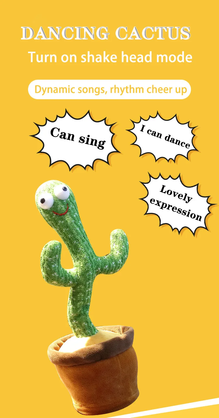 Танцующий кактус, может спеть, может танцевать, научиться говорить, может сиять, может скручиваться с ритмом музыки. Этот продукт имеет батареи и модели зарядки(Для оплаты батареи требуется автономный аккумулятор)