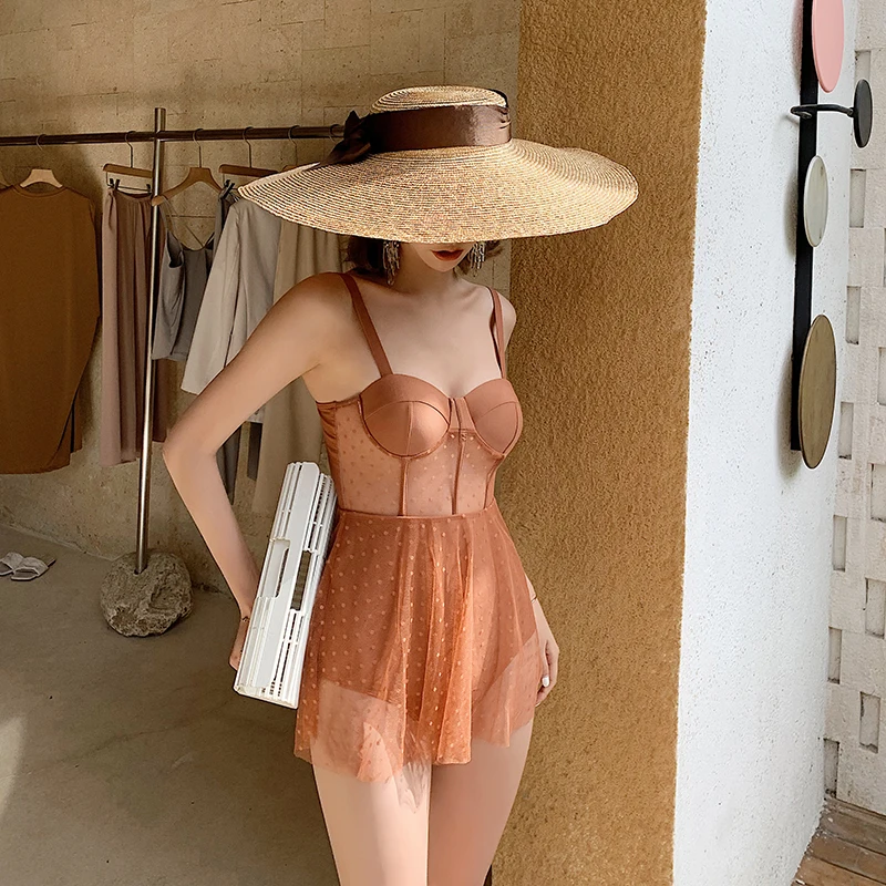 Женский цельный купальник, привлекательный газовый купальник в горошек на бретелях, с высокой талией, с кружевной юбкой в Корейском стиле, купальный костюм с подкладкой