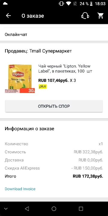 Отличный чай по отличной цене! Заказываю здесь не первый раз. Очень выгодно. С промокодами выходит гораздо дешевле, чем в наших супермаркетах! Интернет-магазин часто проводит различные акции, к примеру: 3 товара по цене 2 (можно сочетать с другими скидками - купонами и промокодами, выходит отличная цена) Больше не хожу в магазины, предпочитаю покупать продукты здесь :) Товар был упакован надёжно, все пришло в целости и сохранности. Быстрая доставка до Сибири - две недели! Не могу не отметить и отзывчивость продавца - оперативно отвечает на все вопросы покупателя. Радует клиентоориентированность интернет-магазина. Буду покупать ещё. Однозначно рекомендую как товар, так и интернет-магазин! А продавцу желаю успехов и процветания в бизнесе!