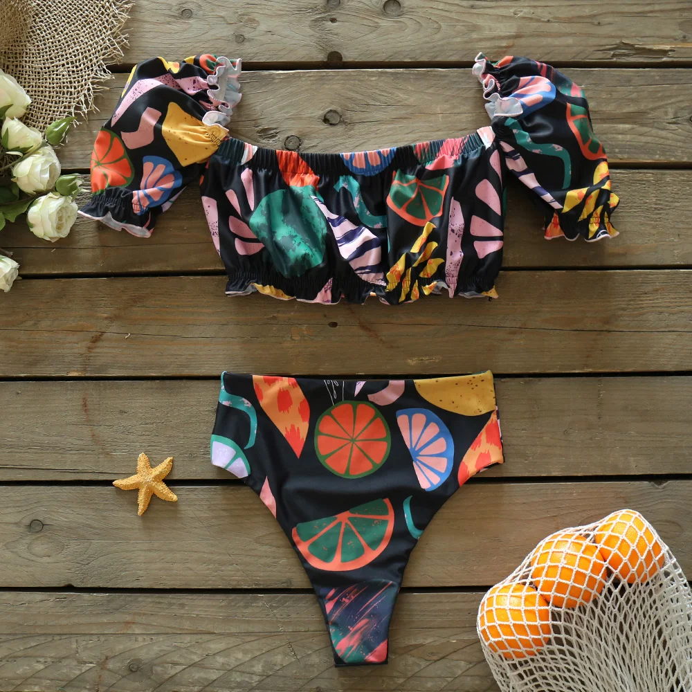 Сексуальный женский комплект бикини с пышными рукавами, Купальник бандо с принтом, купальник с высокой талией, пляжная одежда, бикини для женщин, 2022