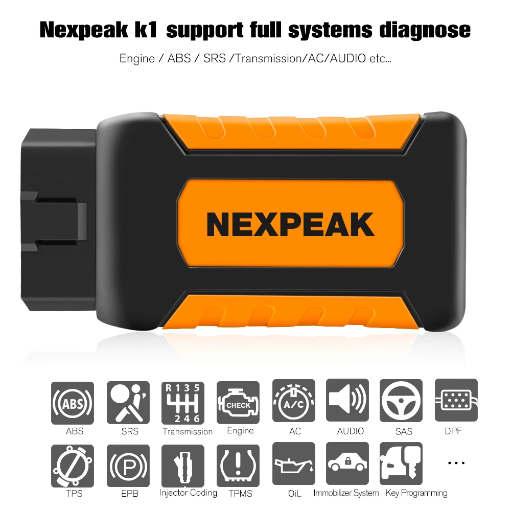 Сканер Nexpeak k1 obd2 поддерживает считывание и очистку кодов неисправностей всех основных систем, включая двигатель, подушки безопасности/SRS, трансмиссия, ABS, SAS, кондиционер, ACC, аудио и т. Д.