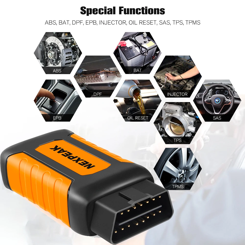NEXPEAK K1 поддерживает специальные функции ABS, BAT,DPF,EPB, инжектор, сброс масла, SAS,TPS,TPMS
