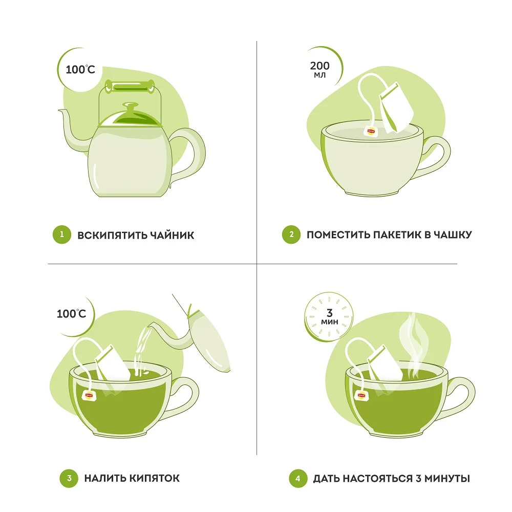 Иногда так хочется свежести и гармонии! Lipton Starligthts готов предложить тебе сочетание чистого зеленого чая с прохладными нотками мятного листа. Чистота и прохлада! Мята с неповторимым свежим ароматом обладает обеззараживающим и расслабляющим действием. Это обусловлено содержанием дубильных веществ, марганца, меди, магния и витамина А. Мятный лист традиционно используют для повышения аппетита и снятия стресса. Основная причина свежего и яркого аромата мяты-эфирные масла, состоящие наполовину из ментола! Научно доказано, что в зеленом чае содержится огромное количество витаминов и микроэлементов, поэтому, выпивая чашку чая, вы не только наслаждаетесь приятным и бодрящим напитком, но и получаете полезные вещества, такие, как: антиоксиданты, аминокислоты и белки, эфирные масла, придающие неповторимый аромат. Чай мягко тонизирует и помогает сконцентрироваться. Идеальный баланс чистоты зеленого чая и и прохлады мятного листа- то, что нужно для свежести и гармонии! Lipton позаботился о сохранении вкуса и аромата, упаковав каждый из 25 чайных пакетиков в индивидуальный сашет. Чтобы насладиться чаем, оставьте пакетик завариться на 3 минуты в горячей воде. Готовый напиток отличается богатым вкусом и гармоничным ароматом. Попробуйте этот чай также в охлажденном виде! Малые действия приводят к большим переменам. Мы заботимся о планете на каждом этапе производства: наша фабрика ООО Юнилевер Русь в Санкт-Петербурге следует принципам Плана устойчивого развития и повышения качества жизни, а электроэнергия для этой площадки поступает от ветропарка. Мы также сотрудничаем с RainForest Alliance, улучшая социальные, экономические и экологические условия жизни людей, которые заботятся о чайных плантациях.