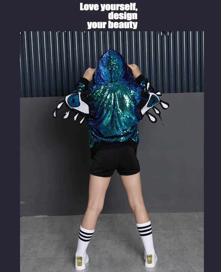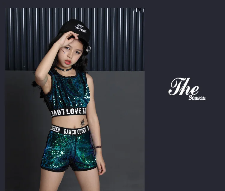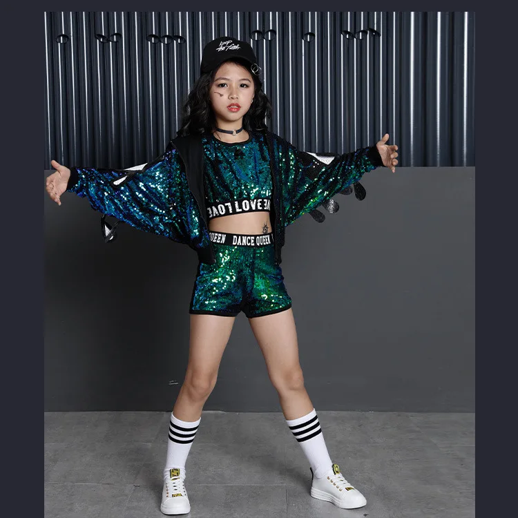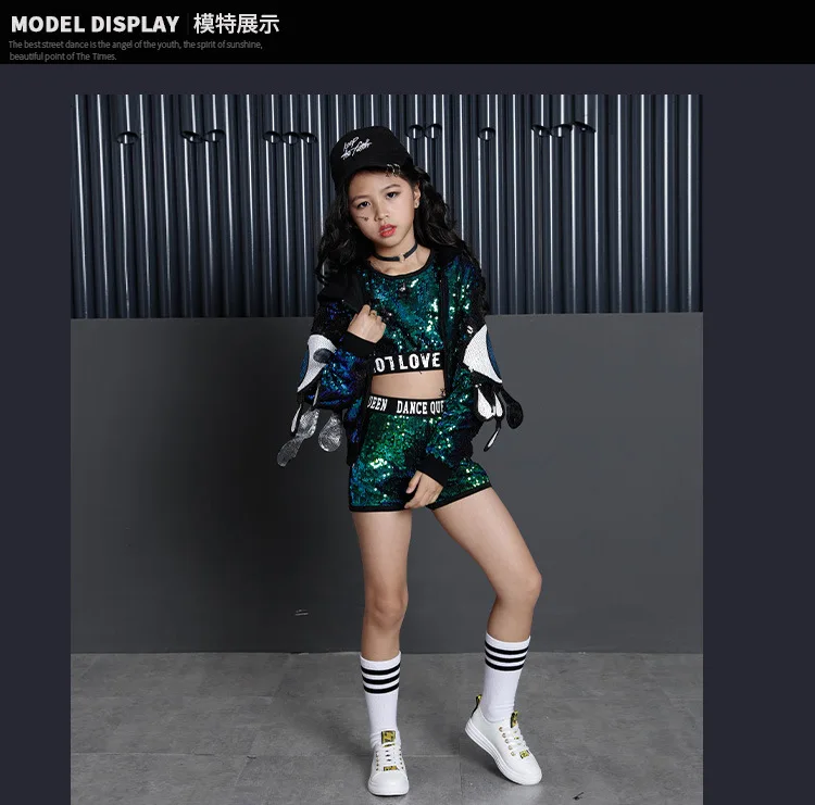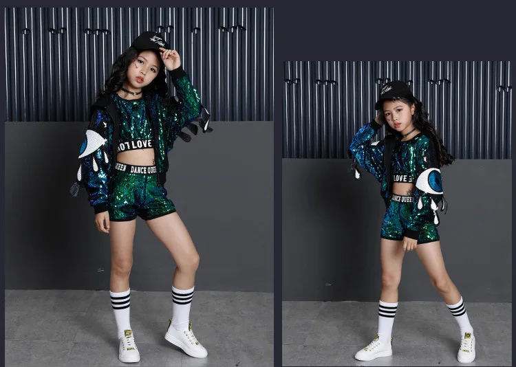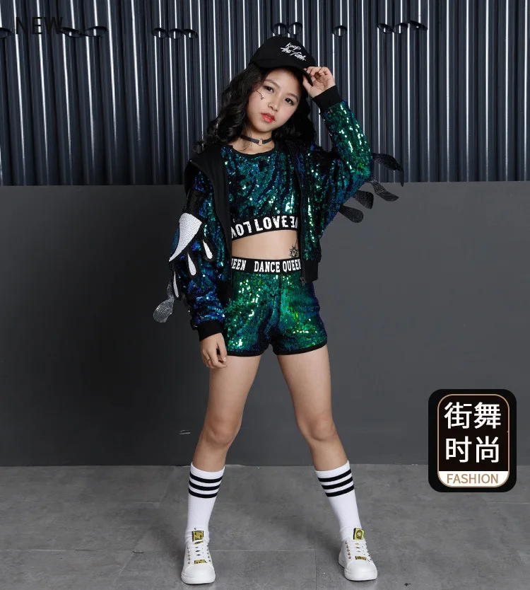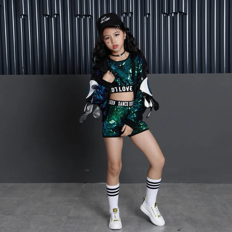 Для детей в стиле хип-хоп, украшенный блестками, куртка с капюшоном для девочек, одежда для девочек, укороченный топ-рубашка на бретелях для девочек и шорты, костюм для танца Джаз Одежда для бальных танцев Одежда