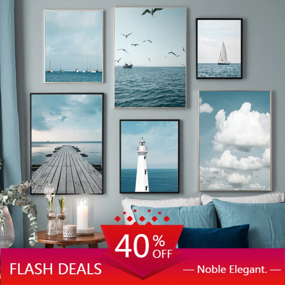 Настенный плакат в скандинавском стиле с изображением синего океана, лодки, маяков, Морского Пейзажа, настенная Картина на холсте, Настенная картина для гостиной, украшение для дома