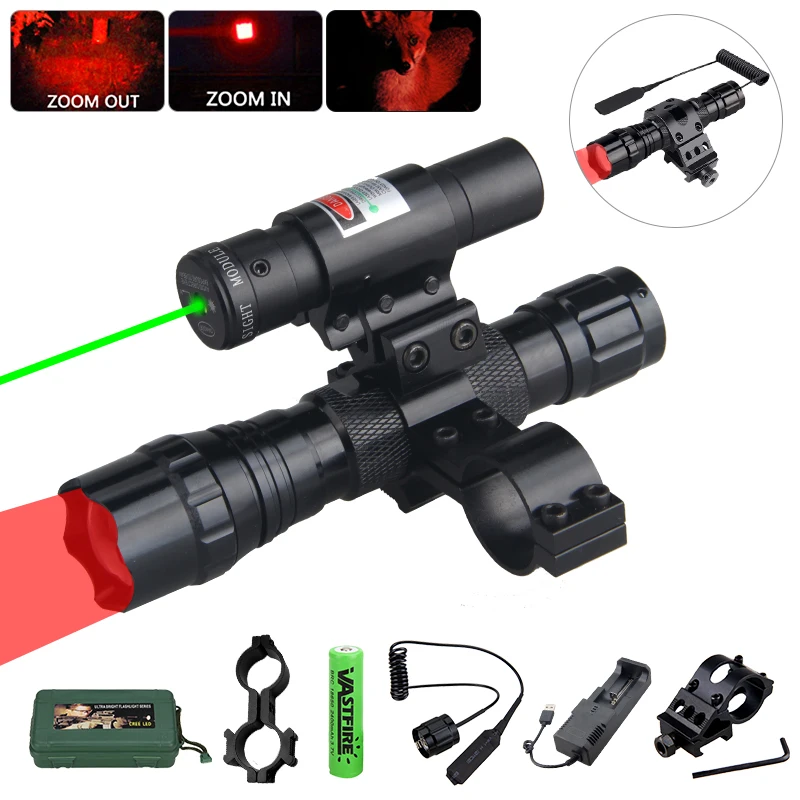 300 ярдов масштабируемый светильник для оружия, ночной охотничий фонарь для хищников + 18650 + зарядное устройство + зажим для винтовки + переключатель + зеленая лазерная точка + коробка