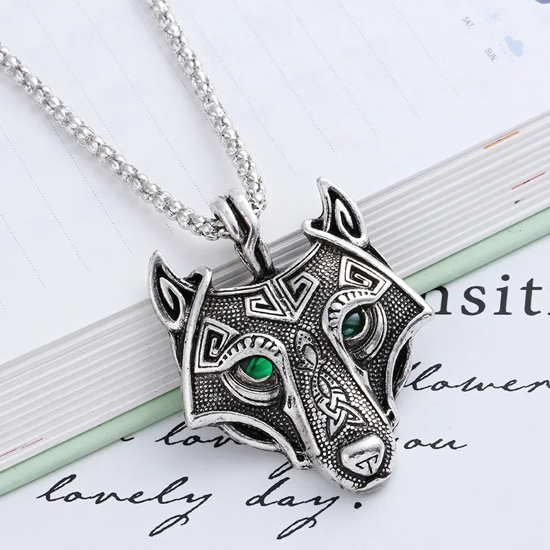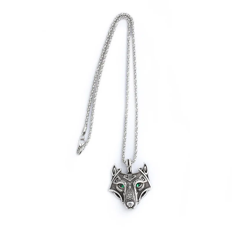 Винтажное ожерелье с подвеской в стиле норвежских викингов скандинавской Волчья Голова зелеными кристаллами ручной работы; Комплект: глаза ожерелье оригинальный животных, ювелирное изделие, ожерелье