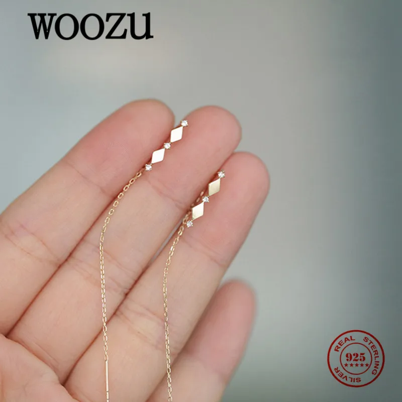 WOOZU реальные 925 стерлингового серебра с покрытием из 14-каратного золота с геометрическим рисунком паве Циркон длинными ушами линии для женщин модные корейские вечерние, ювелирное изделие, подарок