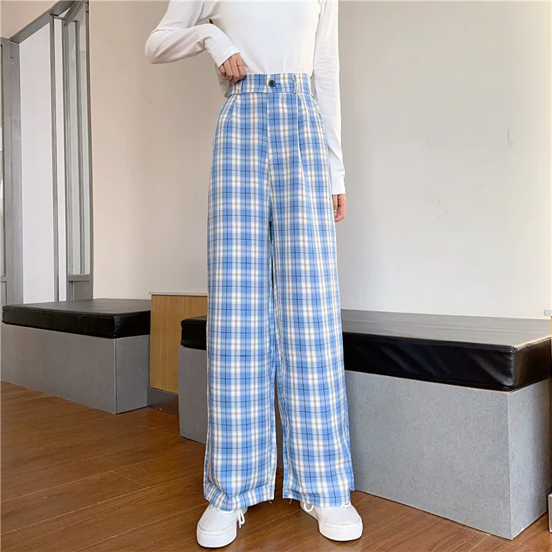 Женские прямые брюки, повседневные свободные брюки в синюю клетку, ...