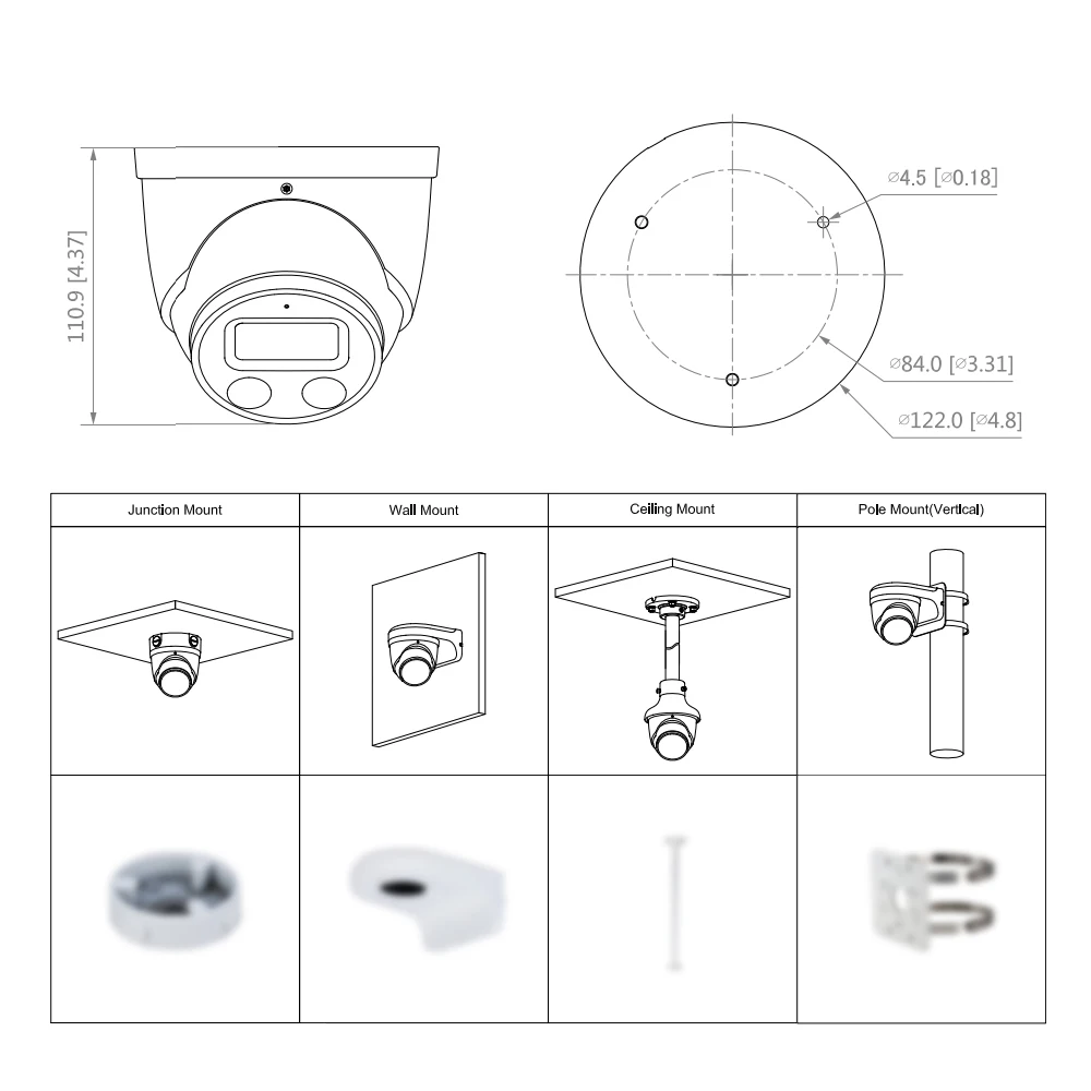 Model: IPC-HDW3849H-AS-PV1.Camera :Image Sensor :1/2.8”8Megapixel progressive CMOSMax. Resolution :3840(H) × 2160 (V)ROM :128 MBRAM :512 MBScanning System :ProgressiveElectronic Shutter Speed :Auto/Manual 1/3 s–1/100,000 sMin. Illumination :0.007 Lux @ F1.4S/N Ratio :> 56 dBIllumination Distance :30 m (98.4 ft)Illuminator On/Off Control :Auto/ManualIlluminator Number :1 (Warm light)Pan/Tilt/Rotation Range :Pan: 0°–360°;Tilt: 0°–78°;Rotation: 0°–360°2.Lens :Lens Type :Fixed-focalMount Type :M12Focal Length :2.8 mm; 3.6 mmMax. Aperture :F1.4Field of View :2.8 mm: Horizontal 107° × Vertical 56° × Diagonal 127°;3.6 mm: Horizontal 89° × Vertical 46° × Diagonal 102°Iris Type :FixedClose Focus Distance :2.8 mm: 1.5 m (4.9 ft);3.6 mm: 2.2m (7.2 ft)3.Professional, intelligent :IVS (Perimeter Protection) :Tripwire; intrusion (support the classification and accurate detection of vehicle and human)Intelligent Search :Work together with Smart NVR to perform refine intelligent search, event extraction and merging to event videos.4.Video :Video Compression :H.265; H.264; H.264H; H.264B; MJPEG(only supported by the sub stream)Smart Codec :Smart H.265+/Smart H.264+Video Frame Rate :Main stream:3840 × 2160 @(1–20 fps by default);3840 × 2160 @(1–25/30 fps with AI function disabled);sub stream: 704 × 576 @ (1–25 fps)/704 × 480 @ (1–30 fps);third stream:1280 × 1080 @ (1–25/30 fps)Stream Capability :3 streamsResolution :8M (3840 × 2160); 6M (3072 × 2048); 5M (3072 × 1728/2592 × 1944); 4M (2688 × 1520); 3M (2048 × 1536/2304 × 1296); 1080p (1920 × 1080); 1.3M (1280 × 960); 720p (1280 × 720); D1(704 × 576/704 × 480);VGA (640 × 480); CIF (352 × 288/352 × 240)Bit Rate Control :CBR/VBRVideo Bit Rate :H.264: 32 kbps–8192 kbps;H.265: 12 kbps–8192 kbpsDay/Night :Color/B/WBLC :YesHLC :YesWDR :120 dBScene Self-adaptation (SSA) :YesWhite Balance :Auto/natural/street lamp/outdoor/manual/regional customGain Control :Auto/ManualNoise Reduction :3D NRMotion Detection :OFF/ON (4 areas)Region of Interest (RoI) :Yes (4 areas)Smart Illumination :YesImage Rotation :0°/90°/180°/270° (Support with 1920 × 1080 resolution and lower)Mirror :YesPrivacy Masking :4 areas5.Audio :Built-in MIC :YesAudio Compression :PCM, G.711a, G.711Mu, G7266.Alarm :Alarm Event :No SD card; SD card full; SD card error; service life warning (supported by Dahua card); network disconnection; IP conflict; illegal access; motion detection; video tampering; tripwire; intrusion; audio detection; voltage detection; external alarm; SMD; safety exception; light alarm; sound alarm (11 built-in sounds and custom voices importing)importing)7.Network :Network :RJ-45 (10/100 Base-T)SDK and API :YesProtocol :IPv4; IPv6; HTTP; TCP; UDP; ARP; RTP; RTSP; RTCP; RTMP; SMTP; FTP; SFTP; DHCP; DNS; DDNS; QoS; UPnP; NTP; Multicast; ICMP; IGMP; NFS; SAMBA; PPPoE; SNMPCyber Security :Video encryption; firmware encryption; configuration encryption; Digest; WSSE; account lockout; security logs; IP/MAC filtering; generation and importing of X.509 certification; syslog; HTTPS; 802.1x; trusted boot; trusted execution; trusted upgradeInteroperability :ONVIF (Profile S/Profile G/Profile T); CGI; Milestone; Genetec; P2PUser/Host :20 (Total bandwidth: 80 M)Storage :FTP; SFTP; Micro SD card (support max. 256 G); NASBrowser :IE: IE8 and later/Chrome/Safari: Safari 12 and later/FirefoxManagement Software :Smart PSS; DSS; DMSSMobile Phone :IOS; Android8.Certification :Certification :CE-LVD: EN62368-1;CE-EMC: Electromagnetic Compatibility Directive 2014/30/EU;FCC: 47 CFR FCC Part 15, Subpart B9.Port :Audio Input :1 channel (RCA port)Audio Output :1 channel (RCA port)Alarm Input :1 channel in: 5mA 3V–5V DCAlarm Output :1 channel out: 300mA 12V DC10.Power :Power Supply :12V DC/PoE (802.3af)Power Consumption :Basic power consumption: 3.1W (DC12V); 3.5W (POE)Max. power consumption (WDR + H.265 + red and blue lights flashing alternately + warm light + sound alarm): 7.8W (DC12V); 8.2W (POE)11.Environment :Operating Conditions :–40°C to +60°C (–40°F to +140°F)/Less than 95% RHStorage Conditions :–40°C to +60°C (–40°F to +140°F)Protection Grade :IP6712.Structure :Casing :MetalDimensions :Φ122.0 mm × 110.9 mm (4.8" × 4.4")Net Weight :754 g (1.7 lb)Gross Weight :915 g (2.0 lb)