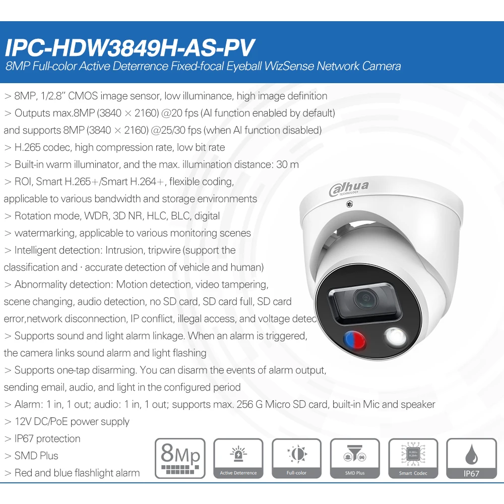 > 8MP, 1/2.8” CMOS image sensor, low illuminance, high image definition> Outputs max.8MP (3840 × 2160) @20 fps (AI function enabled by default)and supports 8MP (3840 × 2160) @25/30 fps (when AI function disabled)> H.265 codec, high compression rate, low bit rate> Built-in warm illuminator, and the max. illumination distance: 30 m> ROI, Smart H.265+/Smart H.264+, flexible coding, applicable to various bandwidth and storage environments> Rotation mode, WDR, 3D NR, HLC, BLC, digital> watermarking, applicable to various monitoring scenes> Intelligent detection: Intrusion, tripwire (support the classification and · accurate detection of vehicle and human)> Abnormality detection: Motion detection, video tampering, scene changing, audio detection, no SD card, SD card full, SD card error,network disconnection, IP conflict, illegal access, and voltage detection> Supports sound and light alarm linkage. When an alarm is triggered, the camera links sound alarm and light flashing> Supports one-tap disarming. You can disarm the events of alarm output, sending email, audio, and light in the configured period> Alarm: 1 in, 1 out; audio: 1 in, 1 out; supports max. 256 G Micro SD card, built-in Mic and speaker> 12V DC/PoE power supply> IP67 protection> SMD Plus> Red and blue flashlight alarm