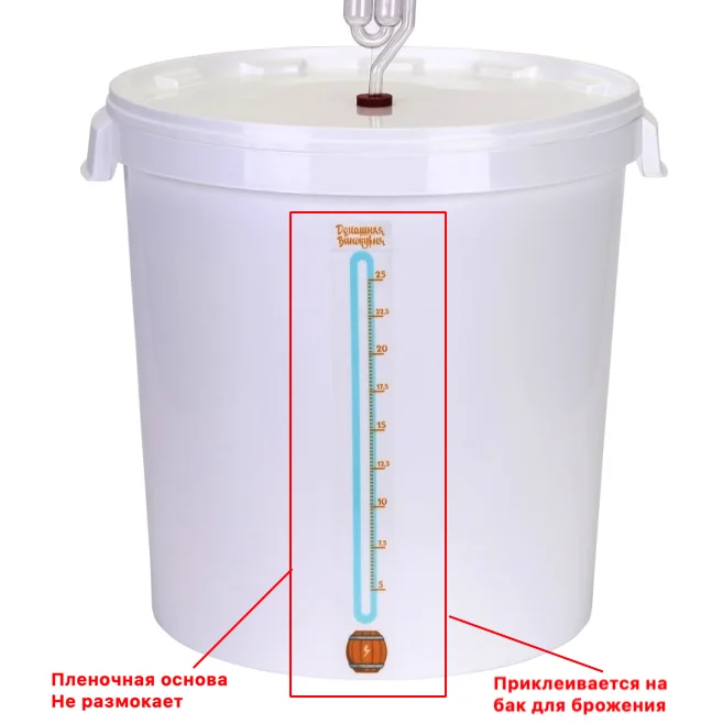 Наклейка-шкала на 30 л бак элементарно приклеивается к баку, прямо с нижней части возвышающейся стороны. Имеет удобную и легко-читаемую разметку объема жидкости, нанесена на прозрачную пленочную основу, очень красиво и эстетично будет смотреться на Вашем баке для брожения емкостью 30 литров. Шкала размечена до 25 литров (полный объем баков (по горло) составляет 32 литра).