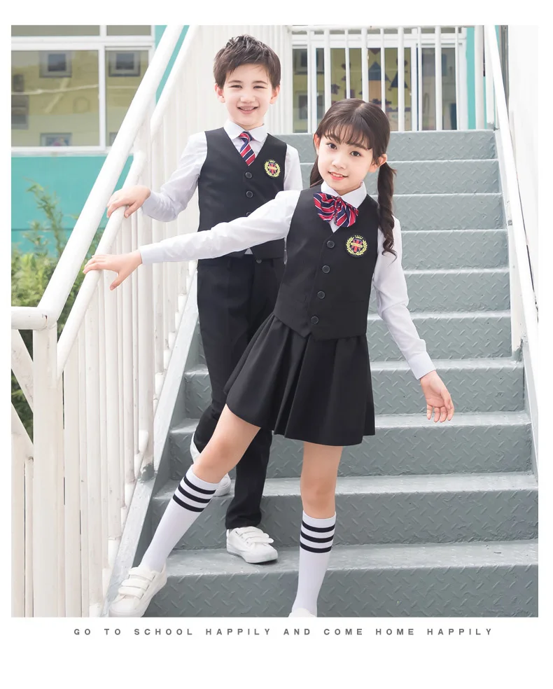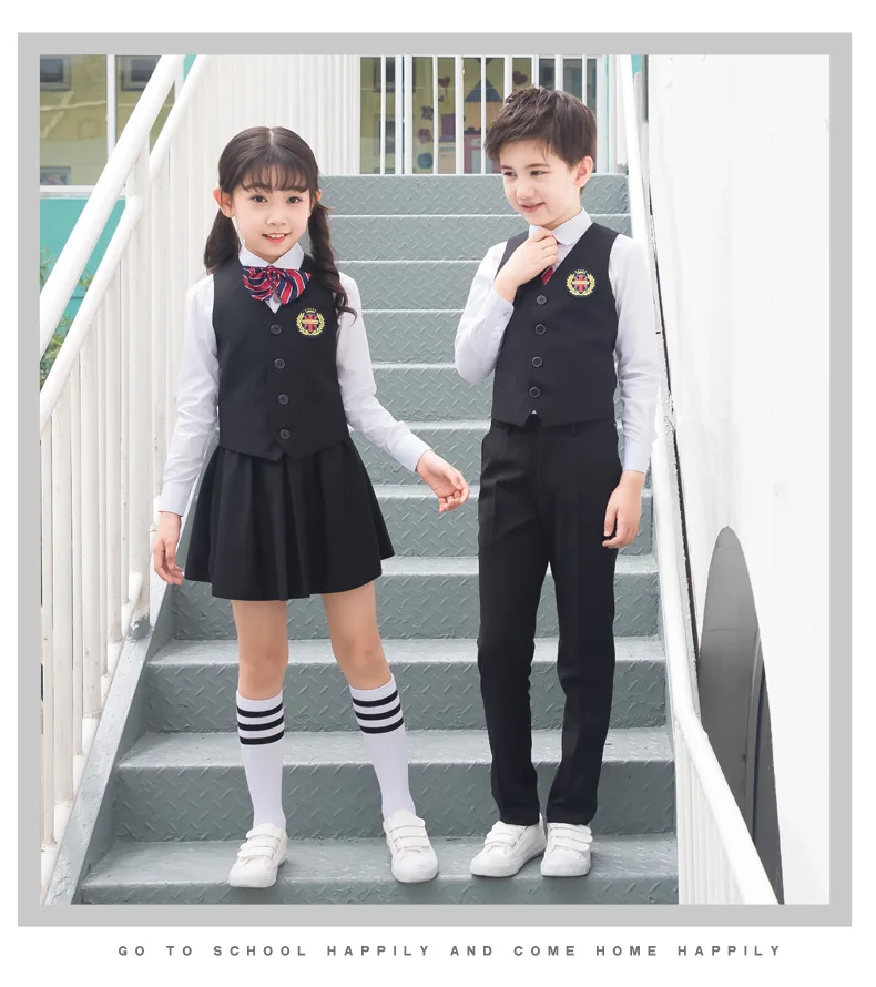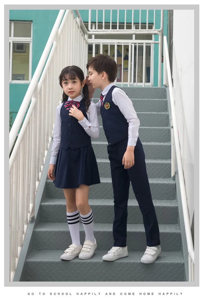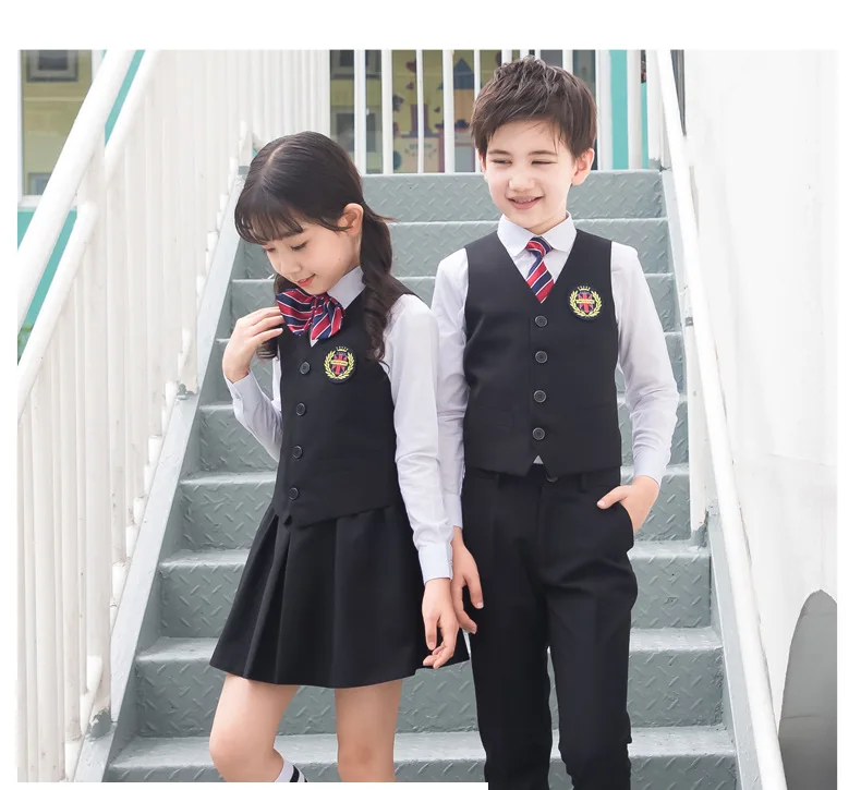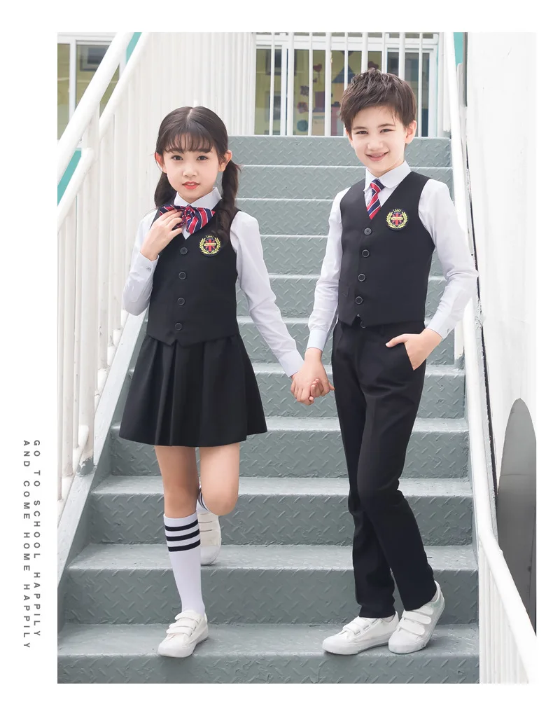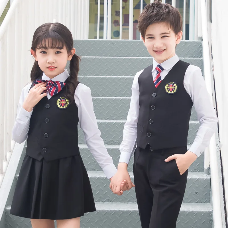 Детская Корейская японская школьная форма для мальчиков и девочек, белая рубашка, темно-синяя юбка, штаны, жилет, комплект одежды с галстуком, костюм для студентов