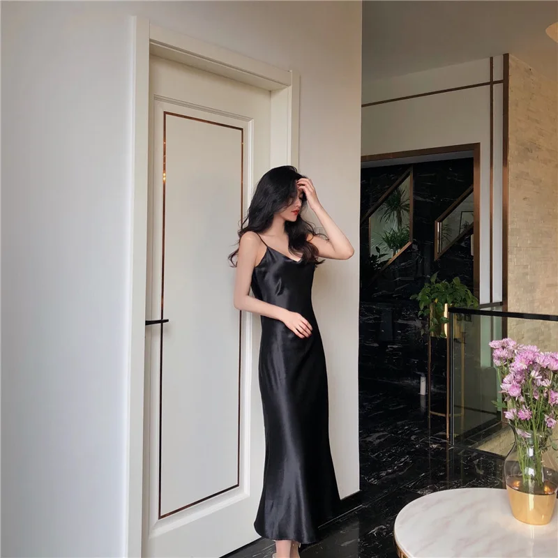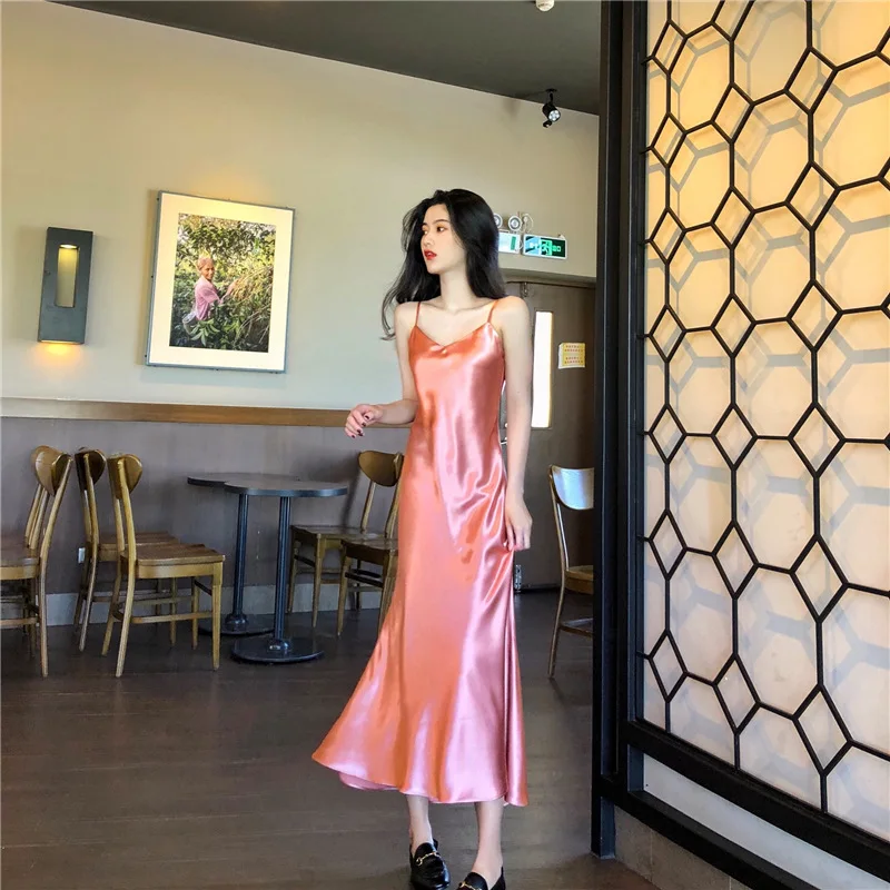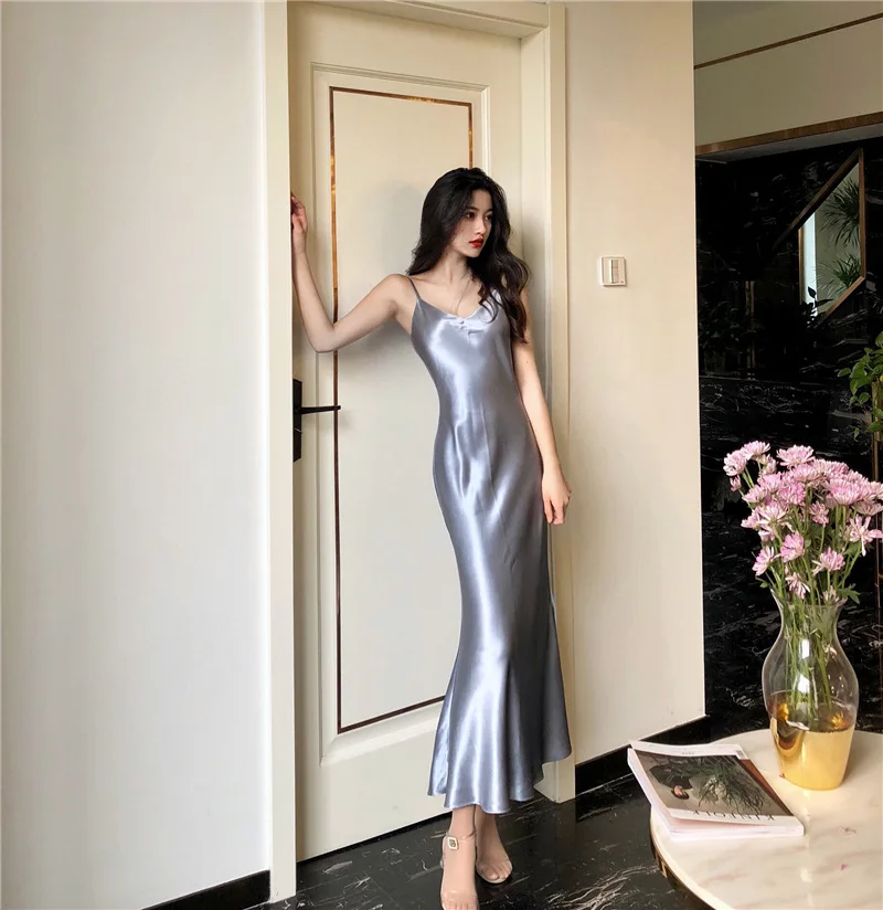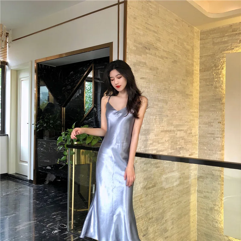 Платье женское атласное без рукавов, длинное пикантное вечернее однотонное, с V-образным вырезом, с юбкой годе, на бретелях, на лето