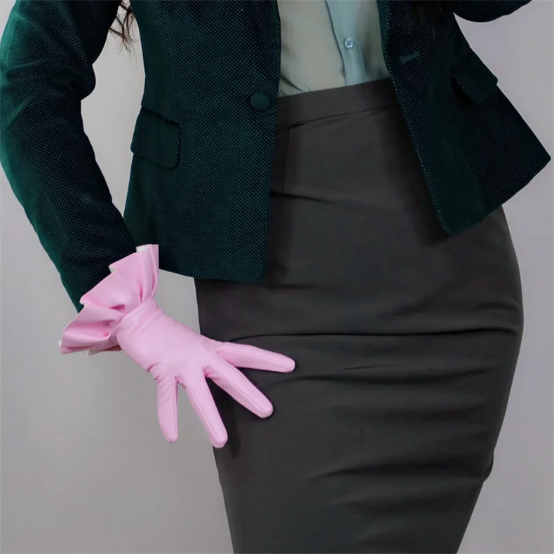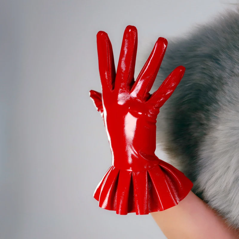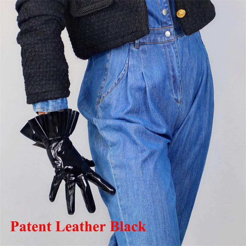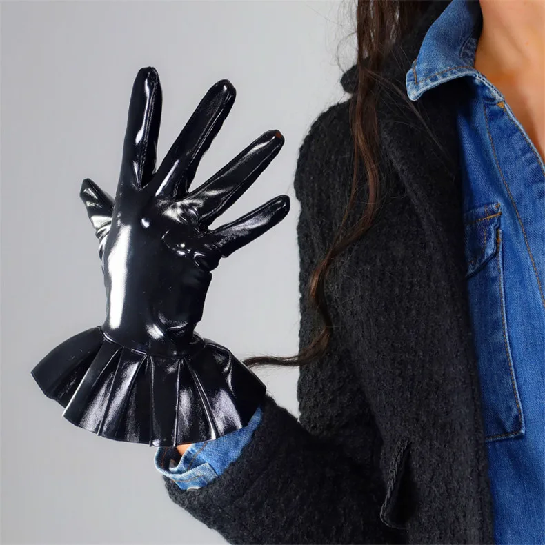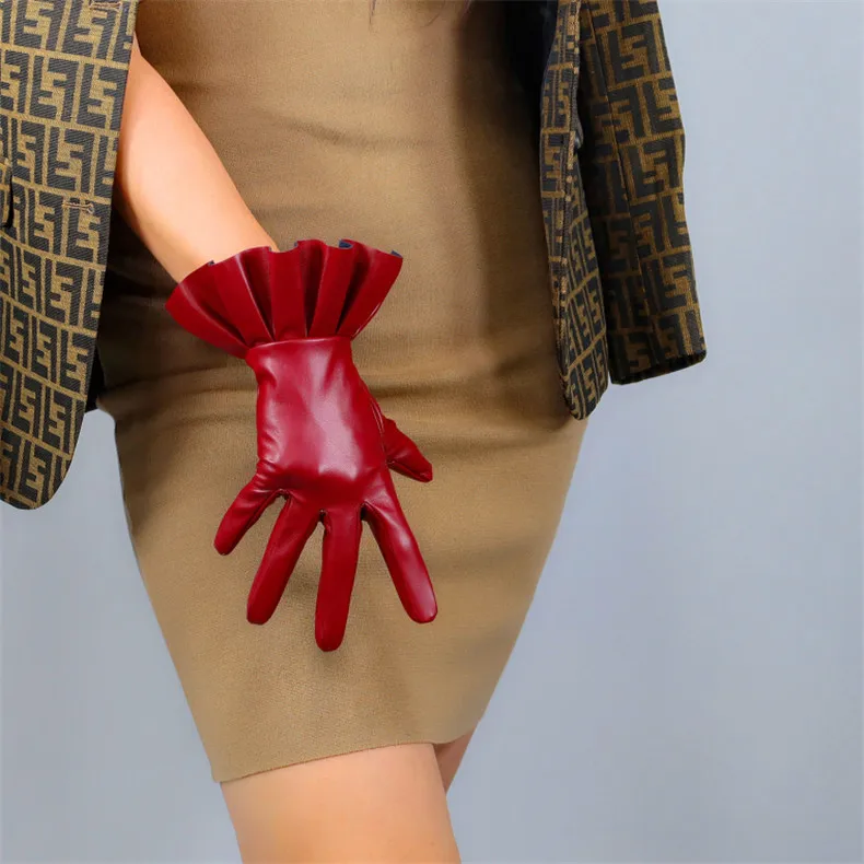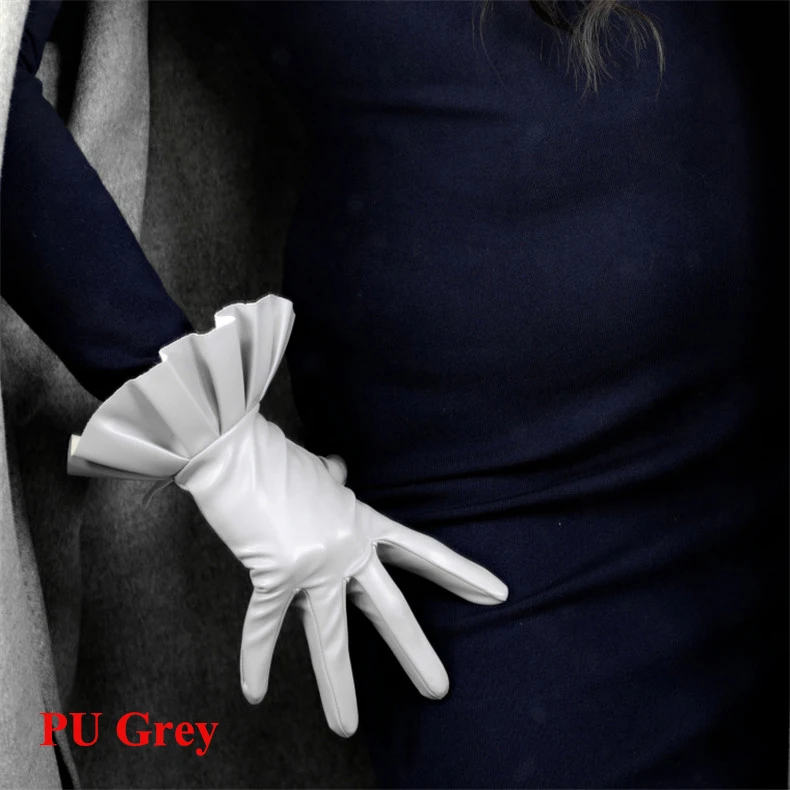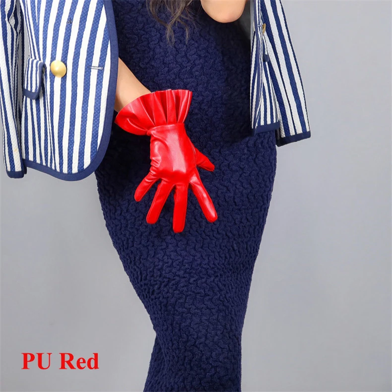 Новинка, женские перчатки из искусственной кожи, 25 см, короткие, искусственная кожа, Волнистые складки, на запястье, кружевные, женские кожаные перчатки, WPU310