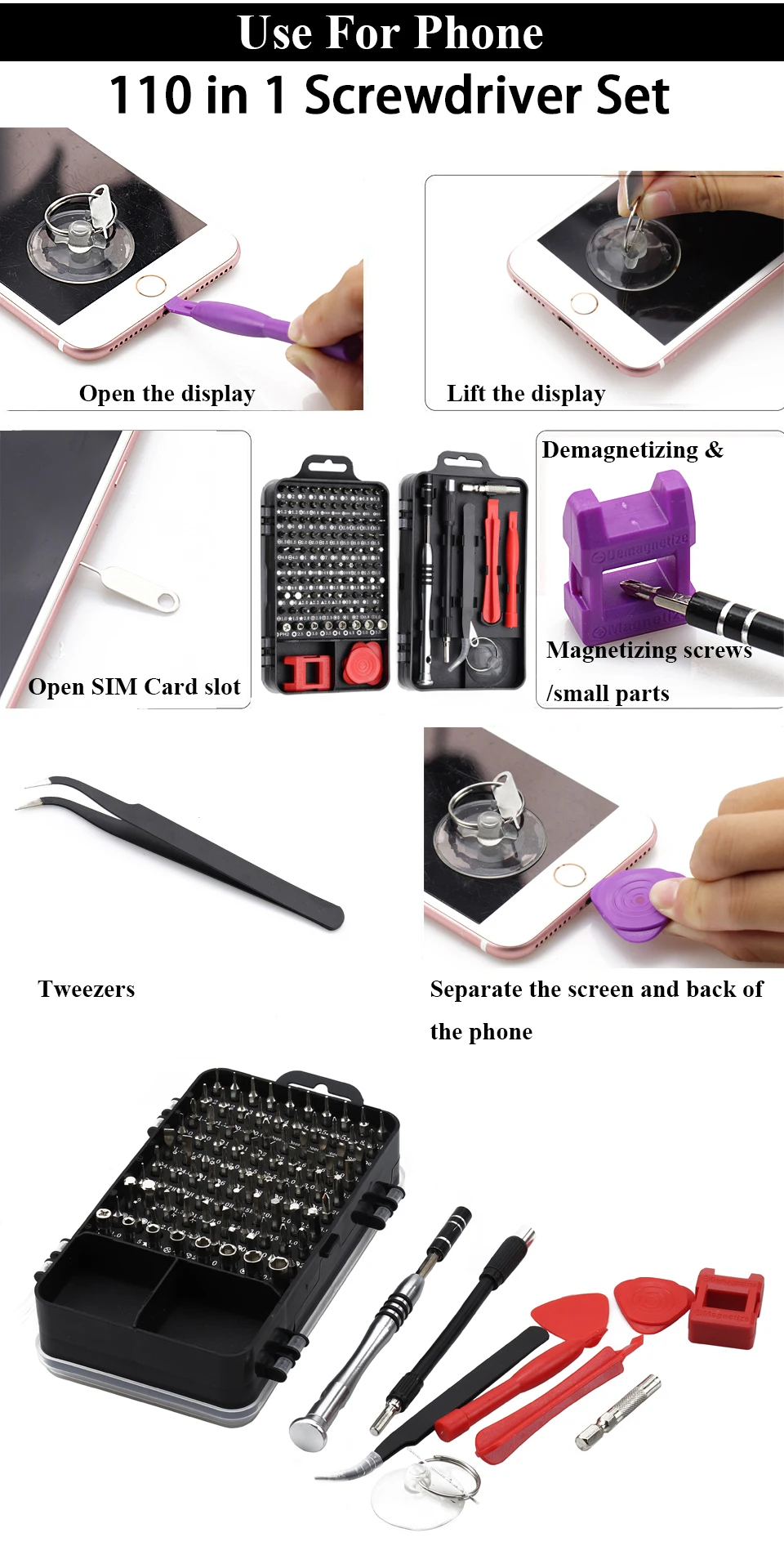 110-in-1 Tool Kit Details98 Screwdriver+12Disassembly Accessories