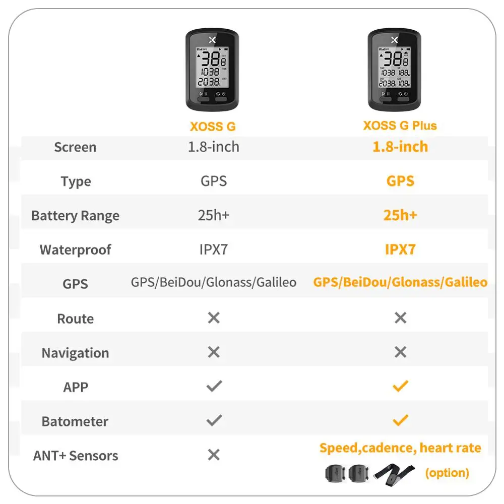 XOSS G является Основной версией gps-компьютера, нет протокола передачи ANT +, и он не поддерживает датчики; Он имеет Bluetooth и поддерживает загрузку в мобильные приложения. XOSS G + GPS компьютер с Bluetooth и ANT + поддержка для добавления датчика скорости/Каденции и монитора сердечного ритма, поддержка загрузки в мобильное приложение;Если вы энтузиазм велоспорта или планируете присоединиться к спорту, вы должны знать важность отслеживания ваших тренировок, чтобы мотивировать себя. Здесь входит XOSS G +. Характеристика:XOSS G запись 9 типов данныхТок/AVG/Максимальная скоростьИстекшее время/высота/часыРасстояние/наклон/Общее расстояние XOSS G + Запись 15 типов данныхТок/AVG/Максимальная скоростьТок/AVG/Максимальная частота сердечных сокращенийТок/AVG/Макс кадментИстекшее время/высота/часыРасстояние/наклон/Общее расстояние