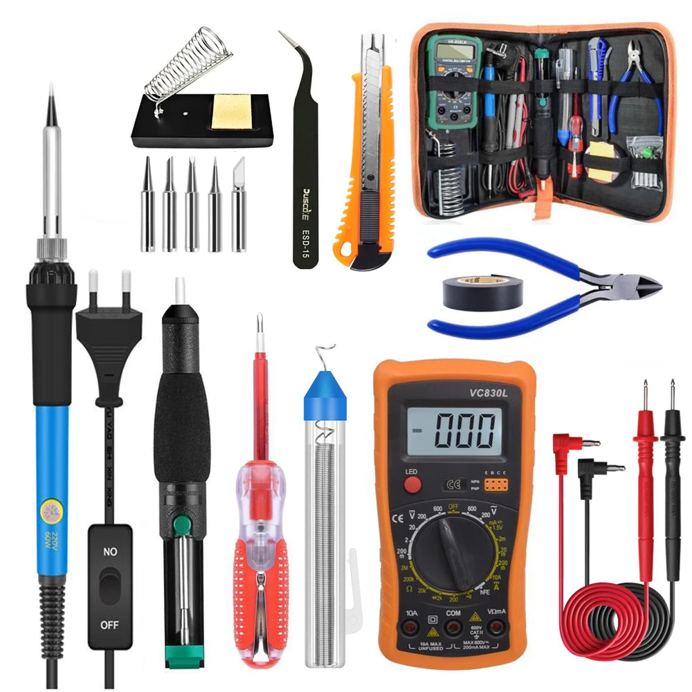 1 паяльник 1 х насос для демонтажа 5 наконечников паяльника 1 x подставка для пайки из нержавеющей стали 1 x паяльная проволока (50 г) 1 х желтая губка 1 х сумка для переноски