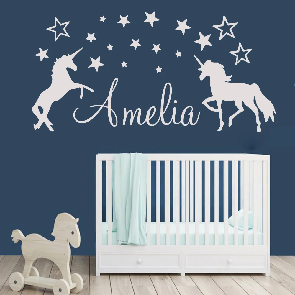 Персонализированная Наклейка на стену в виде единорога, именные наклейки на заказ, съемная виниловая наклейка на стену для детской комнаты для девочек, наклейка в виде единорога