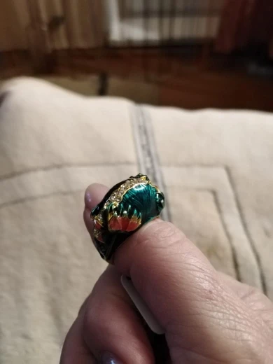 кольцо ужасное! просто ужасное! золото дешёвого цвета,внутри вылеплены как попало камни,роспись яркая,а не нежная,как на фото. как ребенок намалевал зелёнкой. улетело в мусор! Но продавец вернул деньги.