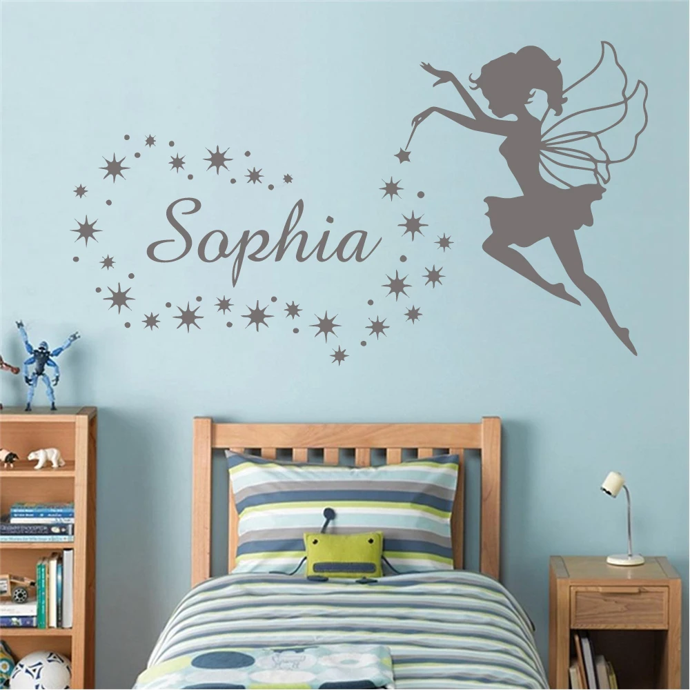 Фея Пользовательское Имя стены Стикеры Ангел настенные наклейки со звездами для девочек, Украшения в спальню детская комната обои наклейка Фотообои