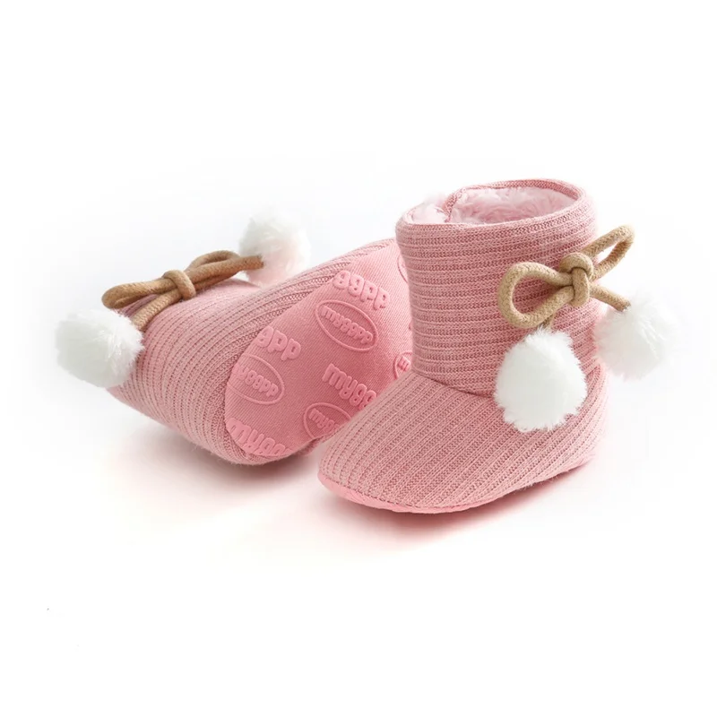 Ботинки детские зимние с мехом, вязаные пушистые шарики, однотонные, с цветочным узором