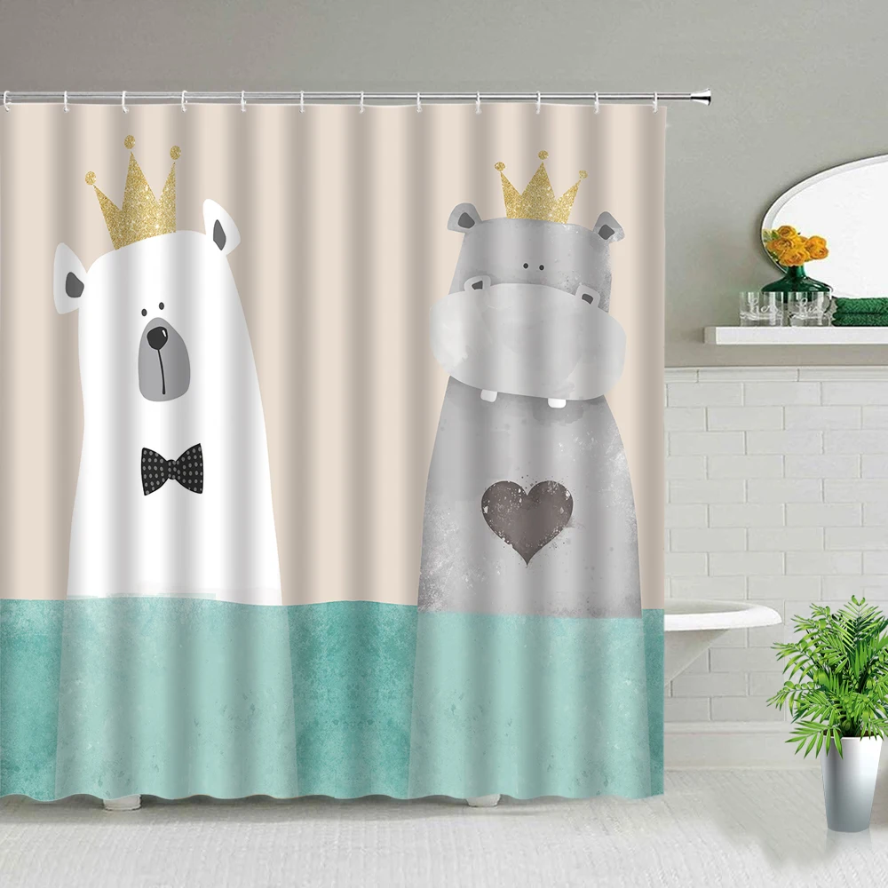 Занавеска для душа с мультяшными животными, кошкой, медведем, кошкой, единорогом, собакой, бегемотом, водонепроницаемая тканевая подвесная занавеска для ванной, декор с крючком