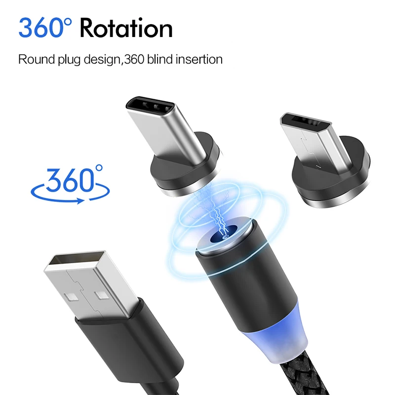 Кабель для быстрой зарядки Type-C, светодиодный, 2 А, магнитный, мини-USB-кабель, зарядное устройство, мобильный телефон для передачи данных, для Xiaomi, 1 м, компьютера, Lapto, Huawei