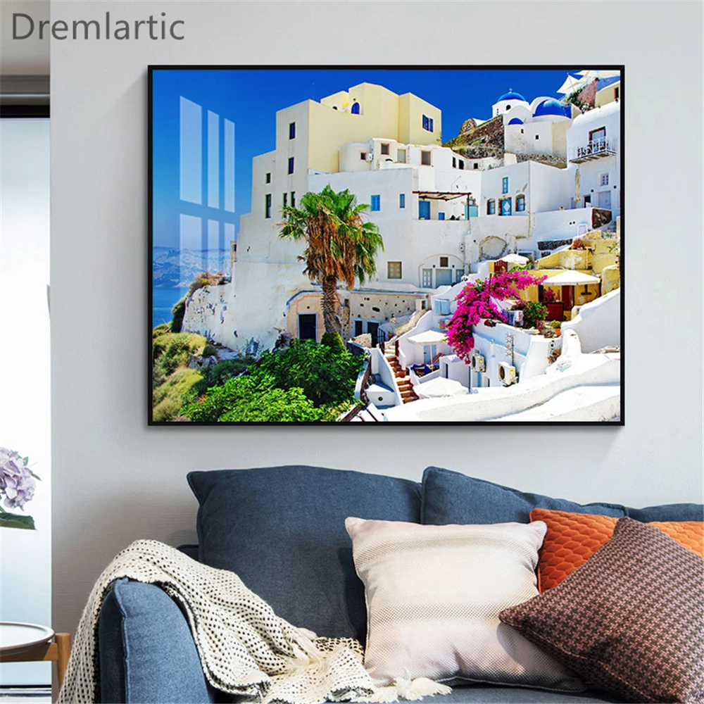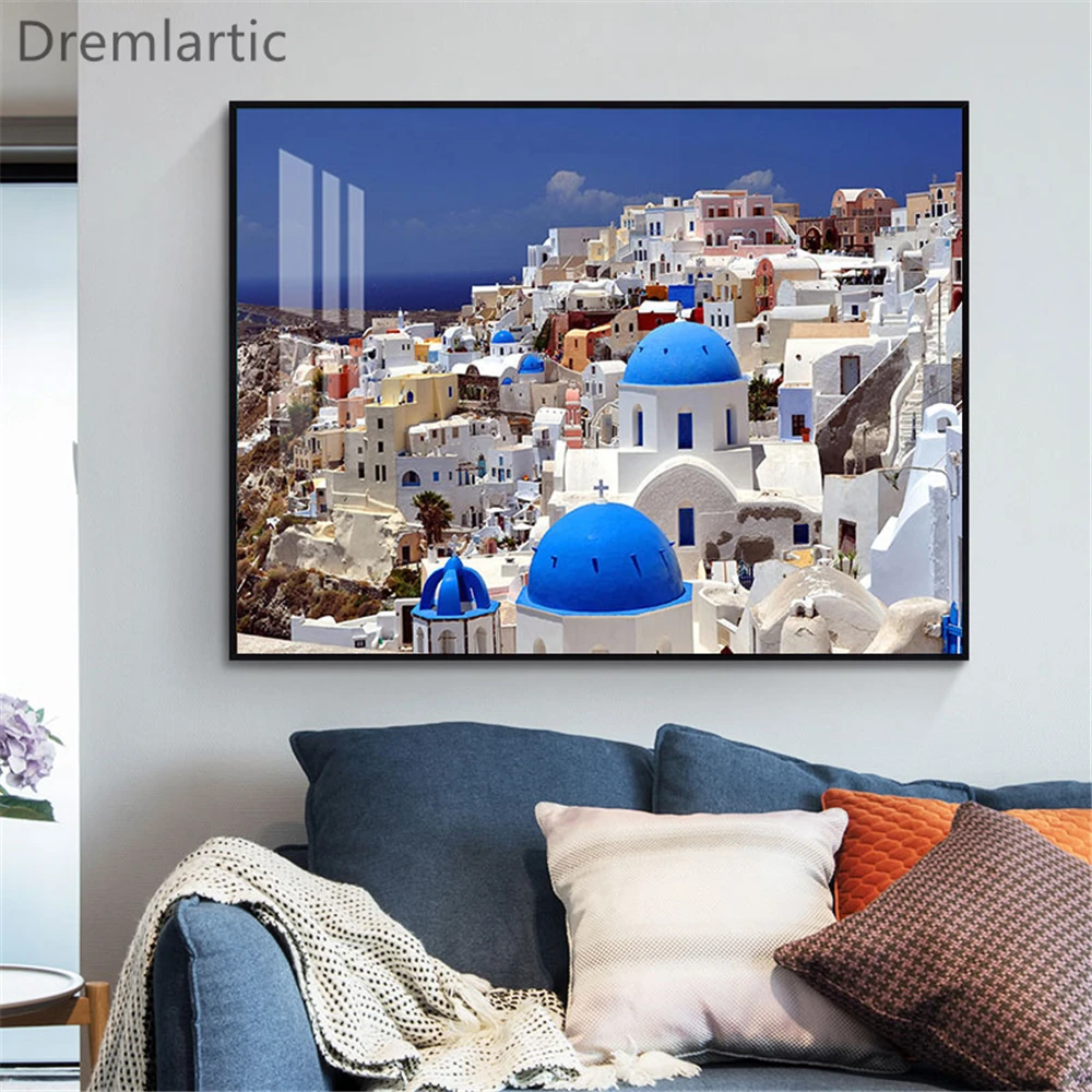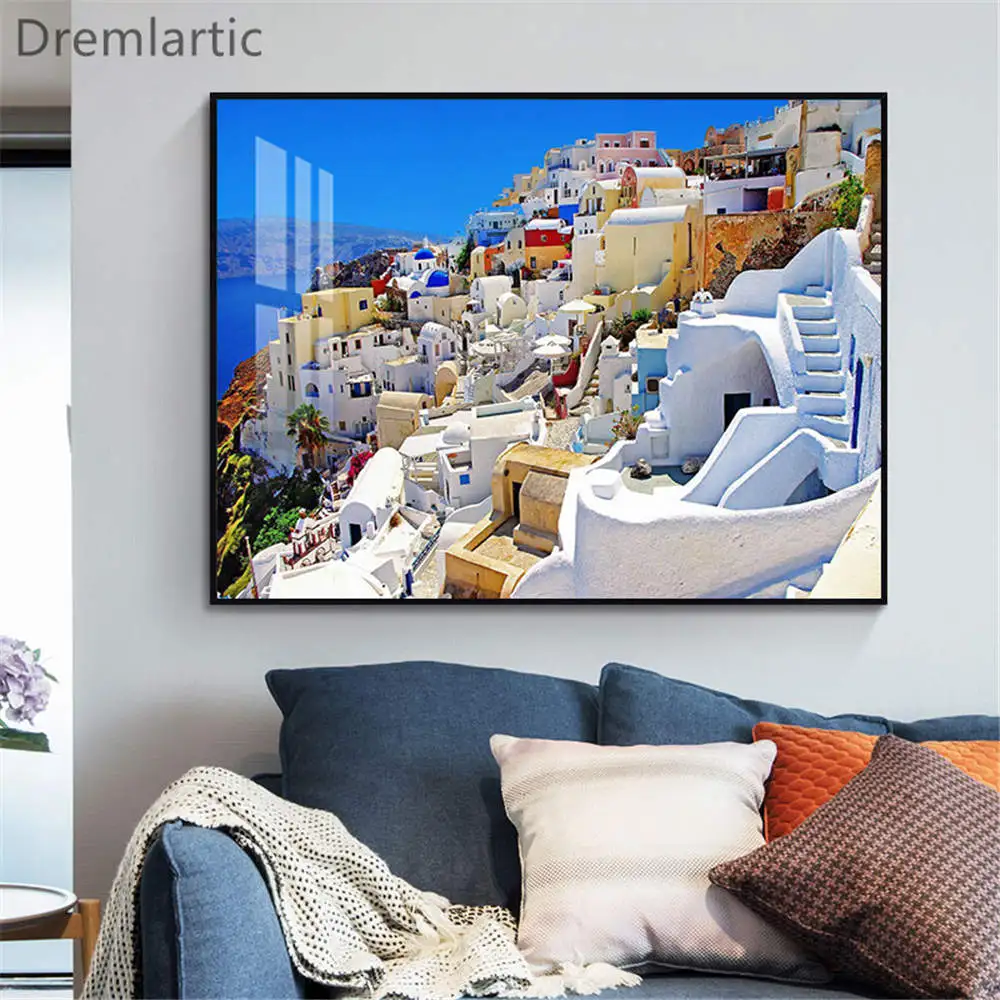 Настенный постер на холсте с изображением Санторини, шелковая ткань, картины для кровати, бара, кафе, гостиной, Декор #21-0121-45