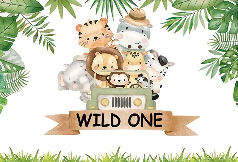 Джунгли дикий один фон зеленые листья сафари животные фон Животные Мальчик 1-й День рождения фотостудия Baby Shower Вечеринка баннер