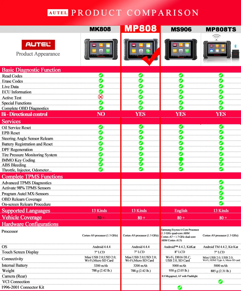 В отличие от MK808BT, Автомобильный сканер диагностический инструмент MP808 на самом деле обладает двунаправленной способностью управления, отправлять команды в системы/компоненты транспортного средства, проверять вход/выход системы без использования элементов управления транспортным средством, например, Включите вентилятор радиатора, Модулируйте дроссельную заслонку, открывайте/закрывайте окна, Управляйте зеркалами, включайте внутреннее и внешнее освещение, звуковой сигнал, Проверьте приводы дверного замка и прочее. (Примечание: выбор зависит от производителя и модели. Свяжитесь с нами для проверки совместимости.)