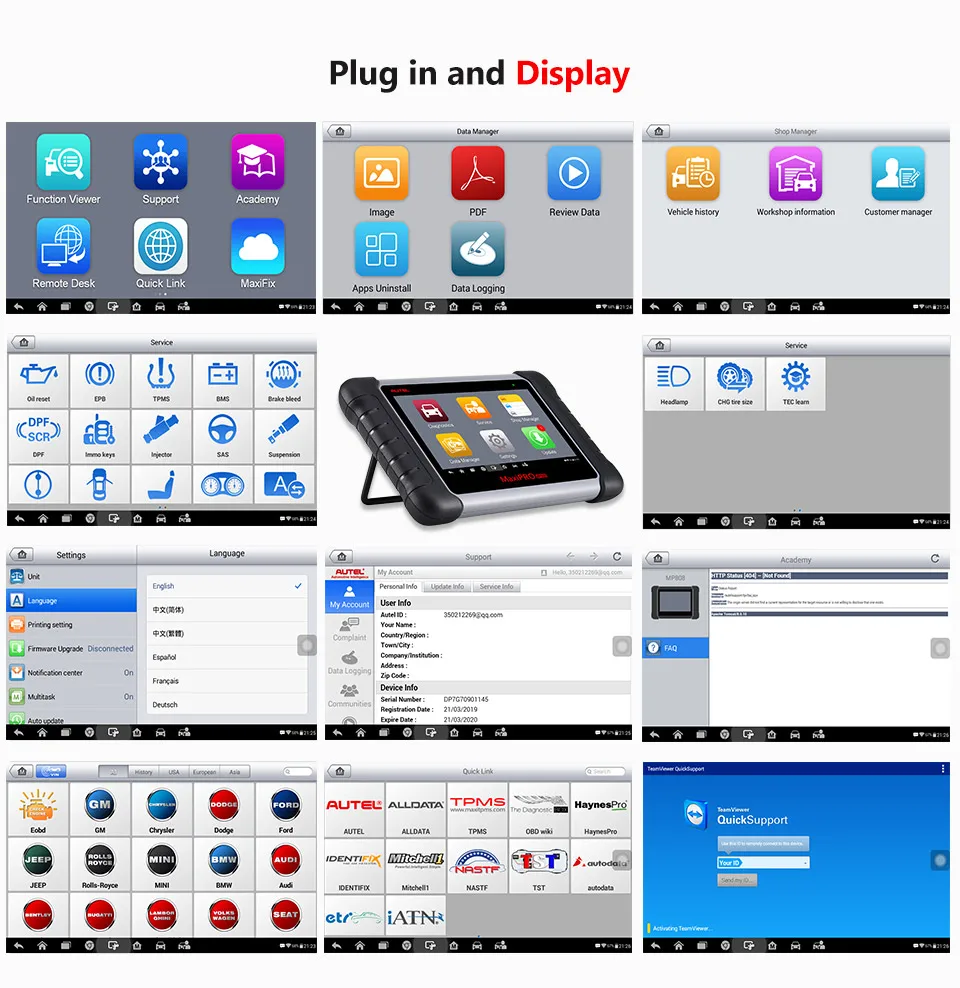 MP808-это диагностический инструмент для планшетов на базе Android и имеет несколько функций и функций в дополнение к диагностическим и сервисным функциям, таким как MaxiFix, Shop Manager, Remote Desk и т. д. Все эти функции оснащены, чтобы обеспечить вам приятный пользовательский опыт и предложить вам способы хорошего управления данными и быстрого решения проблем. 1. MaxiFix-база данных онлайн-устранения неполадок, которая предоставляет вам всю распространенную базу данных DTCs для большинства транспортных средств и позволяет взаимодействовать с другими пользователями. 2. Удаленный стол-работает с поддержкой TeamViewer Quick Support, чтобы вы могли получать удаленную поддержку ad-Special от центра поддержки Autel, коллег или друзей, позволяя им управлять диагностическим инструментом планшета на своем ПК. 3. Менеджер по продажам-приложение, которое поможет вам работать с ежедневной мастерской и улучшить обслуживание клиентов, помогая вам управлять информацией о мастерской, информацией о клиентах и многое другое. 4. Data Manager-хранение, печать и просмотр сохраненных файлов.