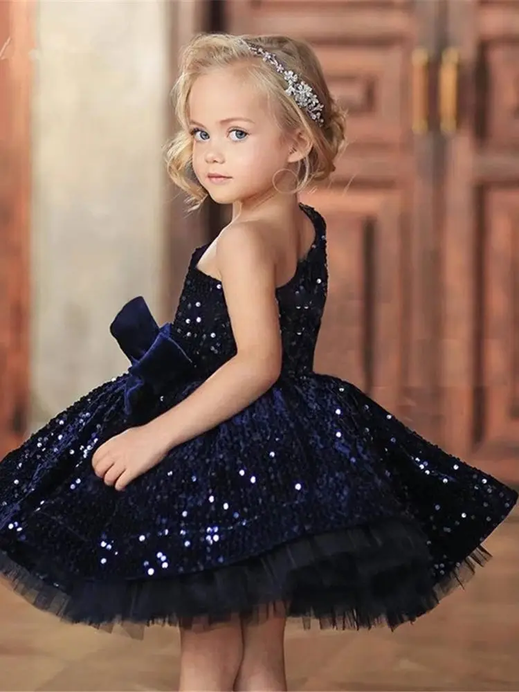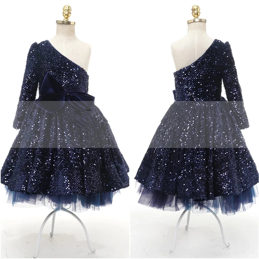 Детские блестящие платья для вечеринок, пышное темно-синее платье п...