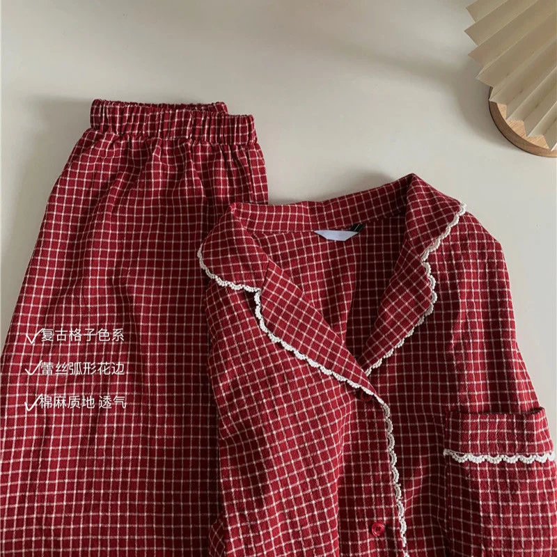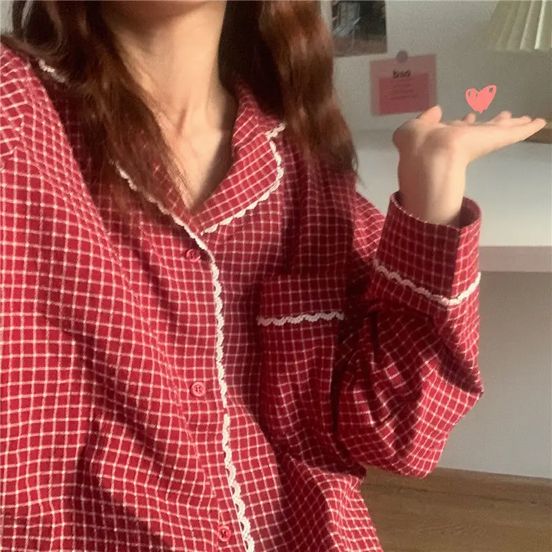 Пижамный комплект Женский в ретро стиле, хлопковая клетчатая длинная пижама в красную клетку, с V-образным вырезом, модная уютная одежда для сна, для отдыха, Осень-зима