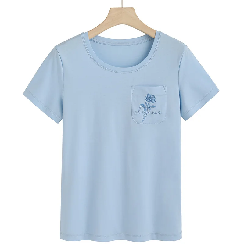 Женская футболка из мерсеризированного хлопка, с коротким рукавом, с вышитыми розами и карманами, 100%