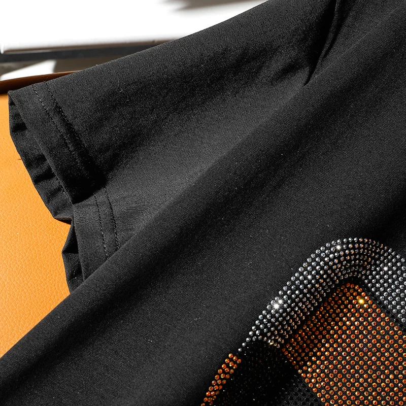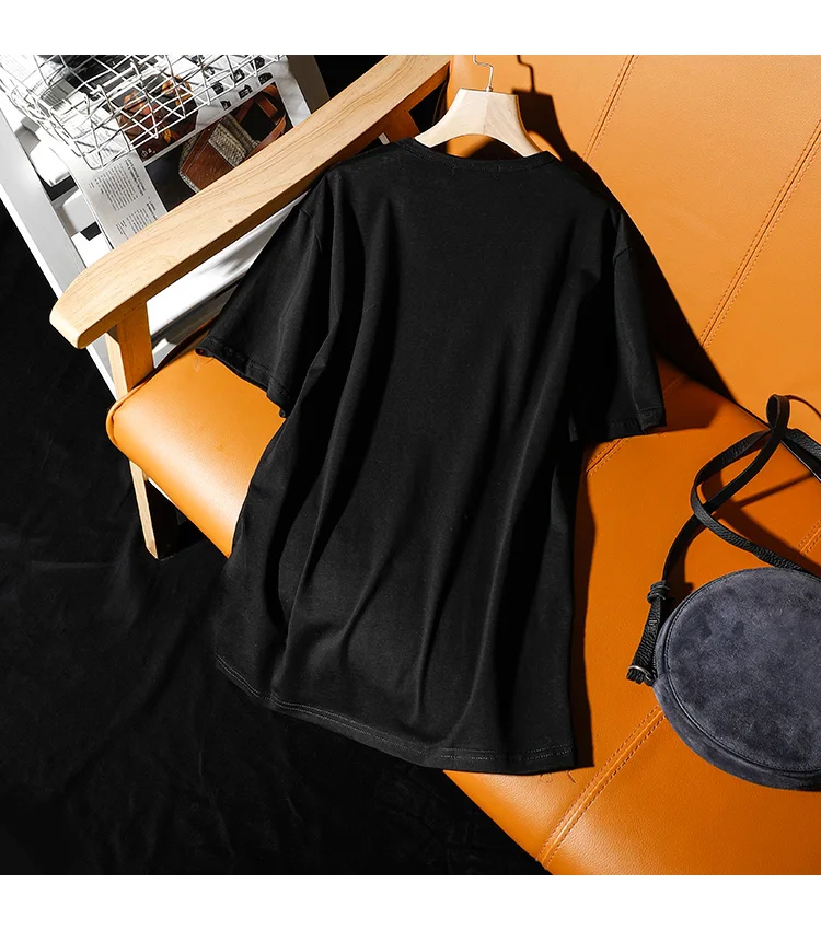 Женская футболка со стразами, черная свободная футболка большого размера с коротким рукавом, модель T109 на лето