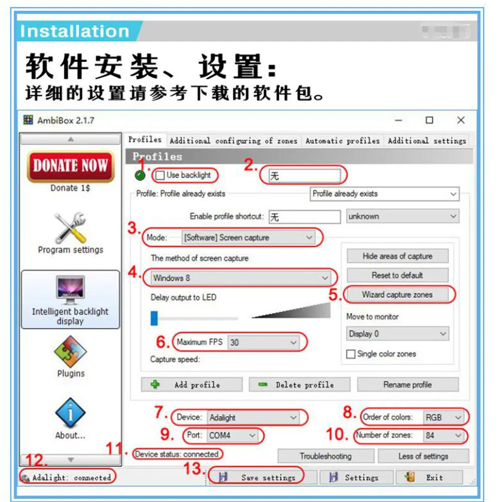 2,3. Выберите устройство и установите его как «Adalight», в меню «Интеллектуальный дисплей подсветки» выберите порт и com-порт, который был обнаружен вашим устройством. Если выбрать правильно, вы можете увидеть состояние устройства: подключено, также внизу слева будет сказано, что Adalight: подключено. Если не удается найти usb-драйвер/com-порт, загрузите USB CH340: https://drive.google.com/file/d/1GS5FrjN5620I_RKJMOe5IAGNSqlke9jC/view?usp=sharing