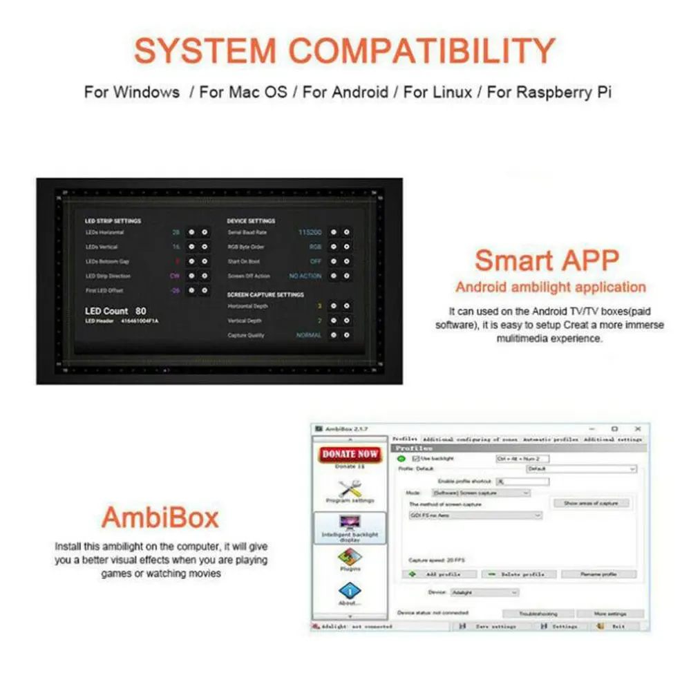 Характеристики освещения AMBIBOXThe:-Настройка цветового баланса для каждого светодиодный полосы отдельно.-Индивидуальная Регулируемая область захвата для каждого светодиодный полосы-общая средняя Цвет для всех областях режим вычисления-постоянная подсветка (лампа) режим-захват видео-захвата от игр (GDI, DirectX 10/11)